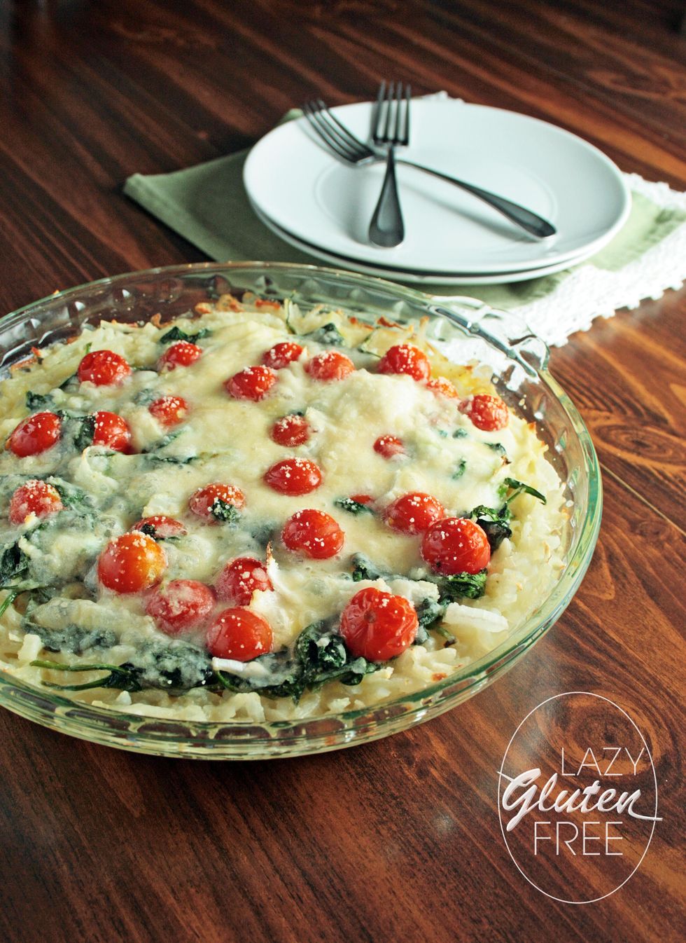 ) Preheat oven to 375F and grease an 8-inch round cake or pie pan. Press thawed hash browns into the bottom and sides of the dish. Top with 1/2 cup mozzarella cheese.
