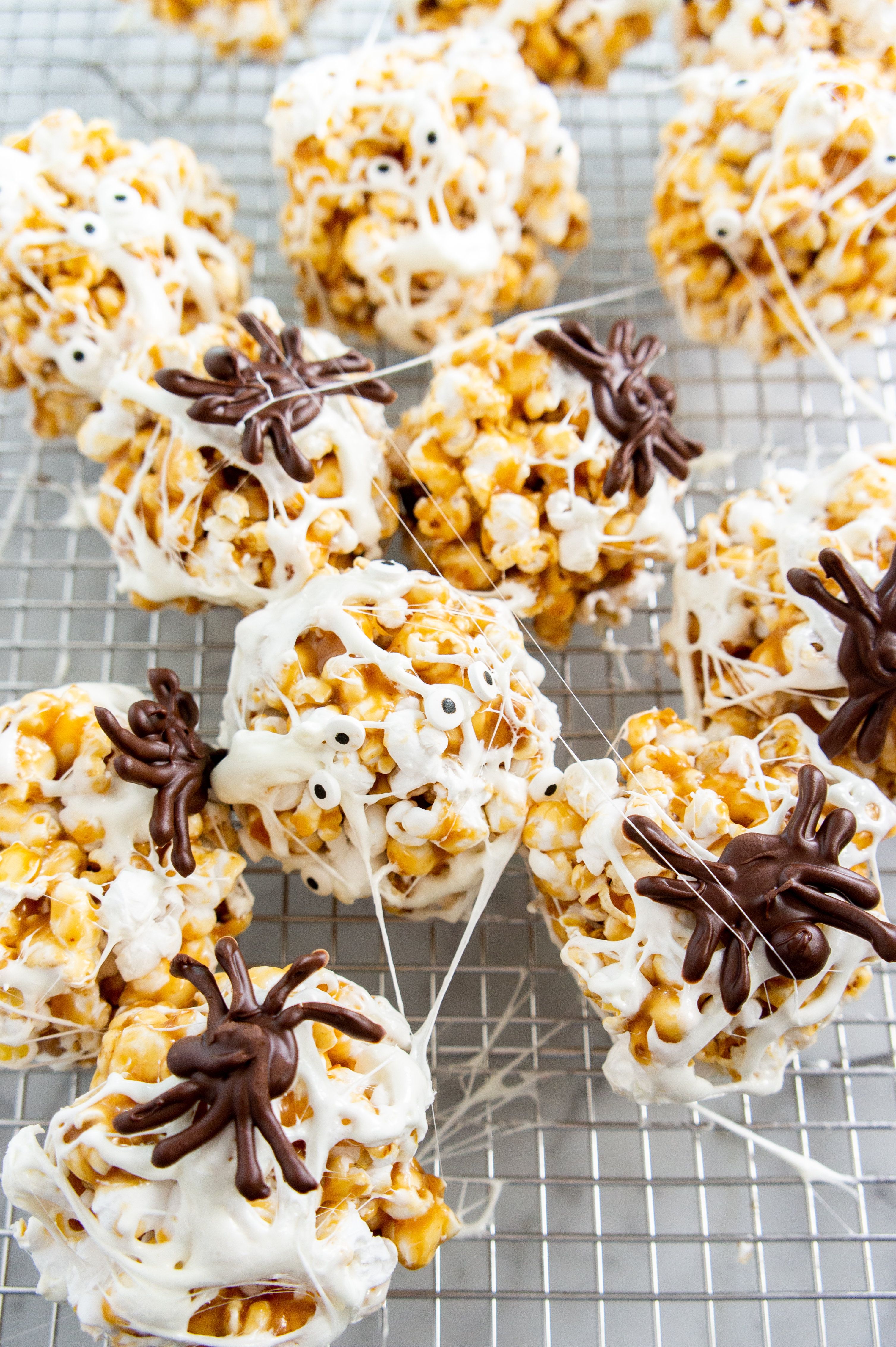 These popcorn balls are the perfect snack idea for a Halloween party or movie night! Fresh popcorn is tossed with a soft, vanilla caramel and wrapped in spooky marshmallow spider webs and chocolate spiders! You can also turn use candy eyes to make mummy popcorn balls. A great Halloween idea for kids and so fun to make and eat!