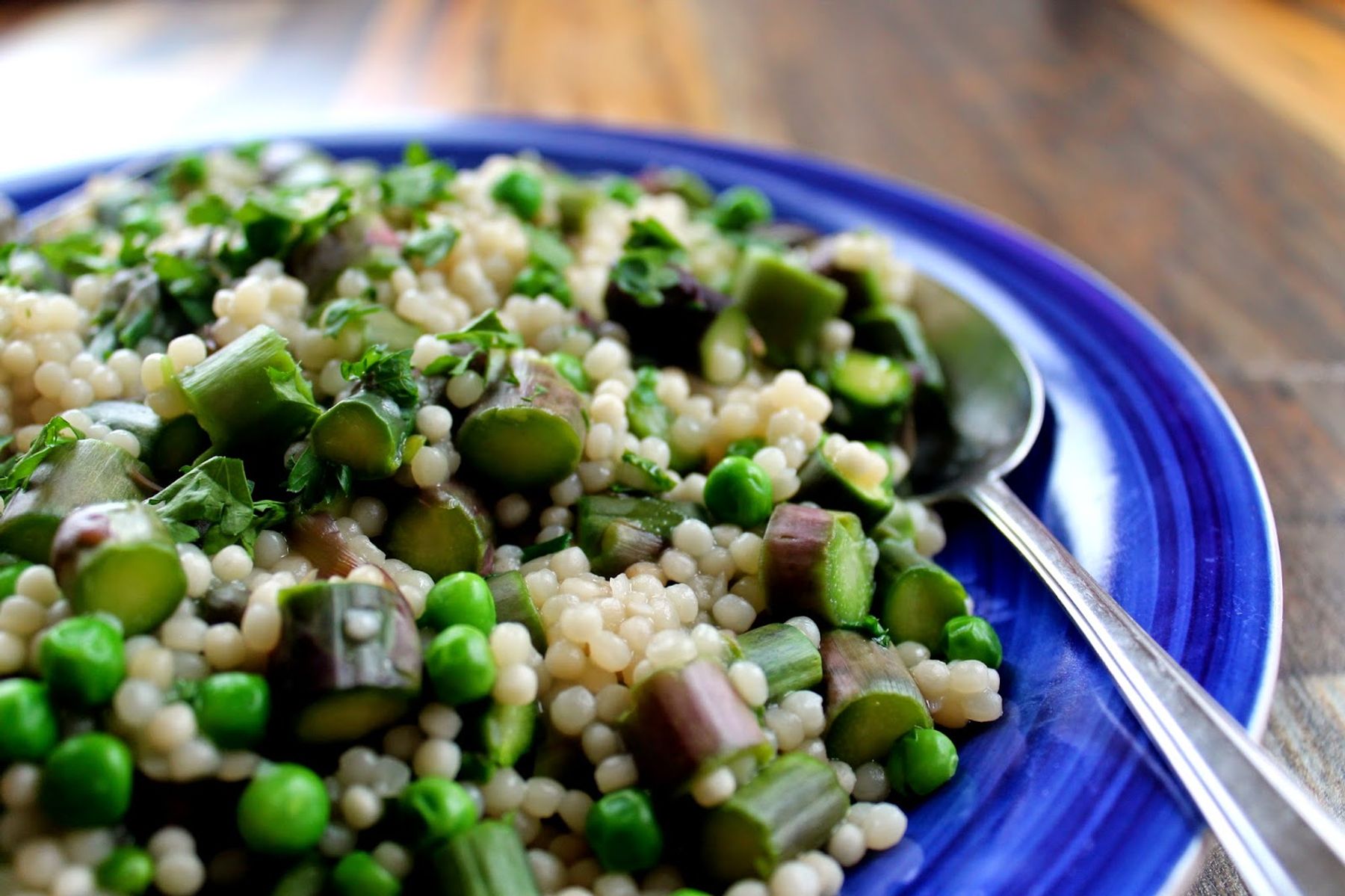 Cook couscous according to package instructions with the broth substituted for water. 5 minutes before cooking is complete, add asparagus and peas. Once finished toss with herbs, and adjust seasoning. Serve...