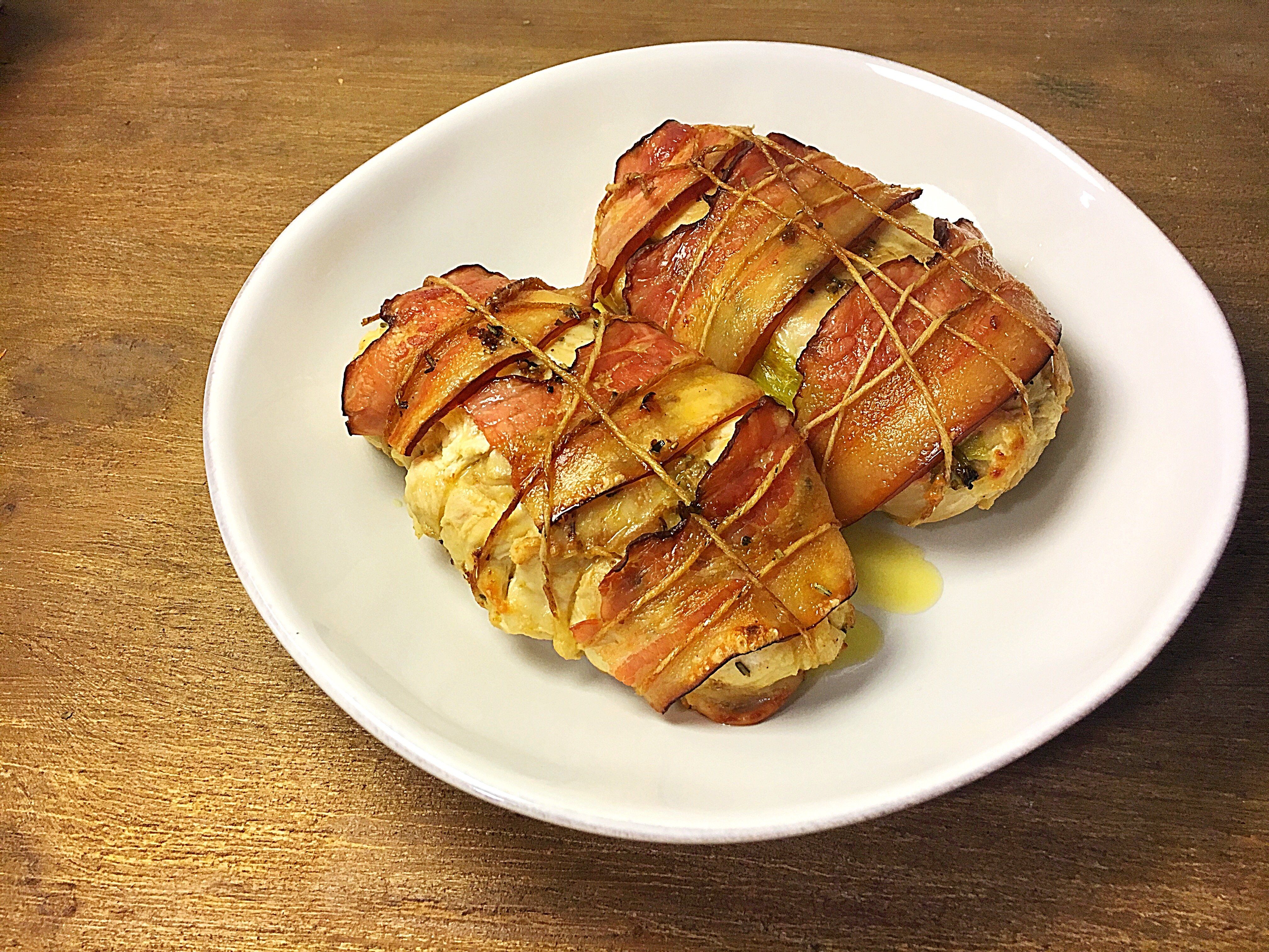 Chicken breast stuffed with spring onions and cottage cheese. Sprinkled grated Parmesan to get that salted flavor. Bacon strips coated in honey gives a crispy rich texture.