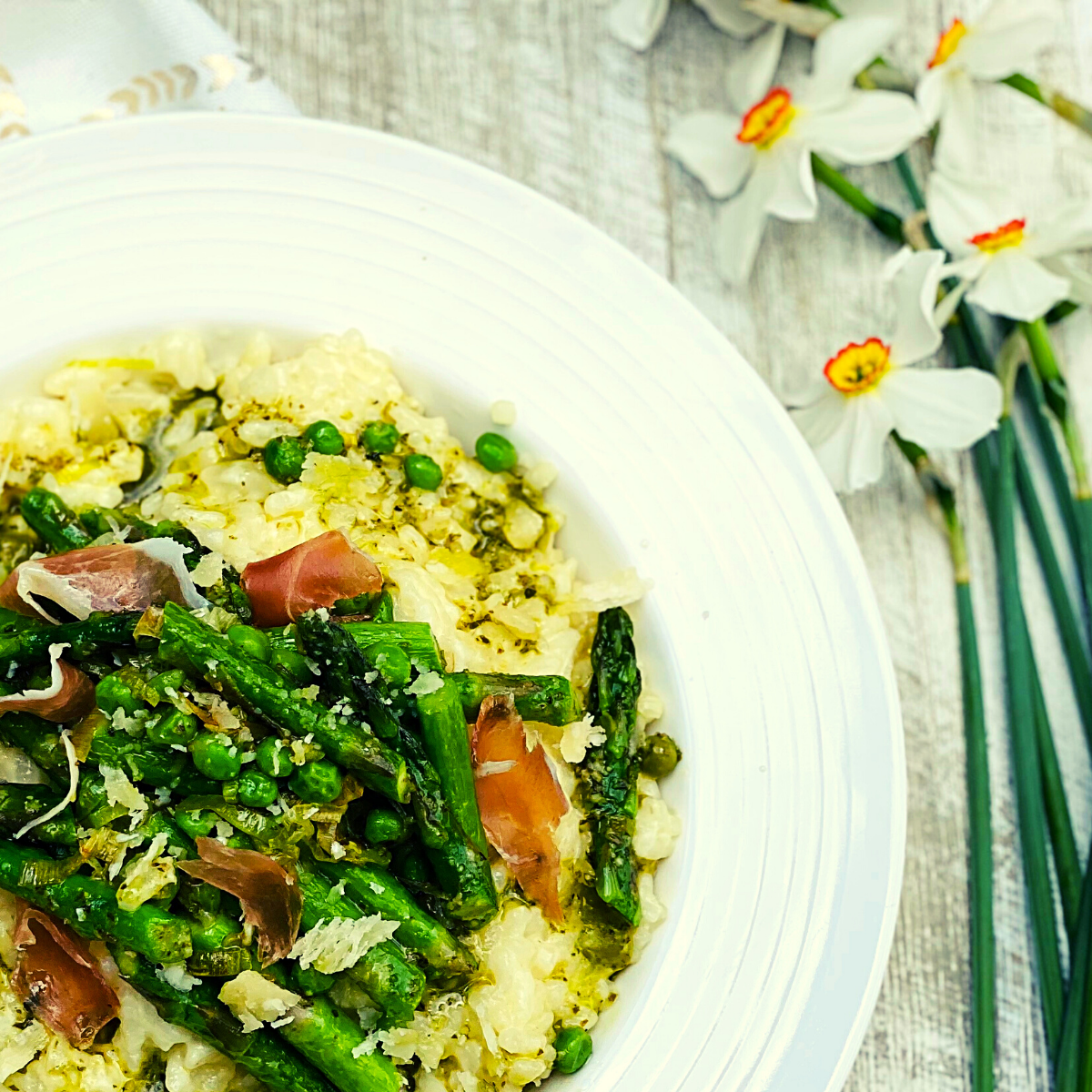 Enjoy risotto in spring. Make this creamy, comforting, and fresh risotto topped with mint pesto and spring vegetables, and a little prosciutto, too. This spring pesto risotto recipe is a great Italian dish for a special occasion like a Mother's Day brunch or just a perfect weeknight meal. I'll show you how to make risotto ahead of time, so you can prepare dinner even faster.