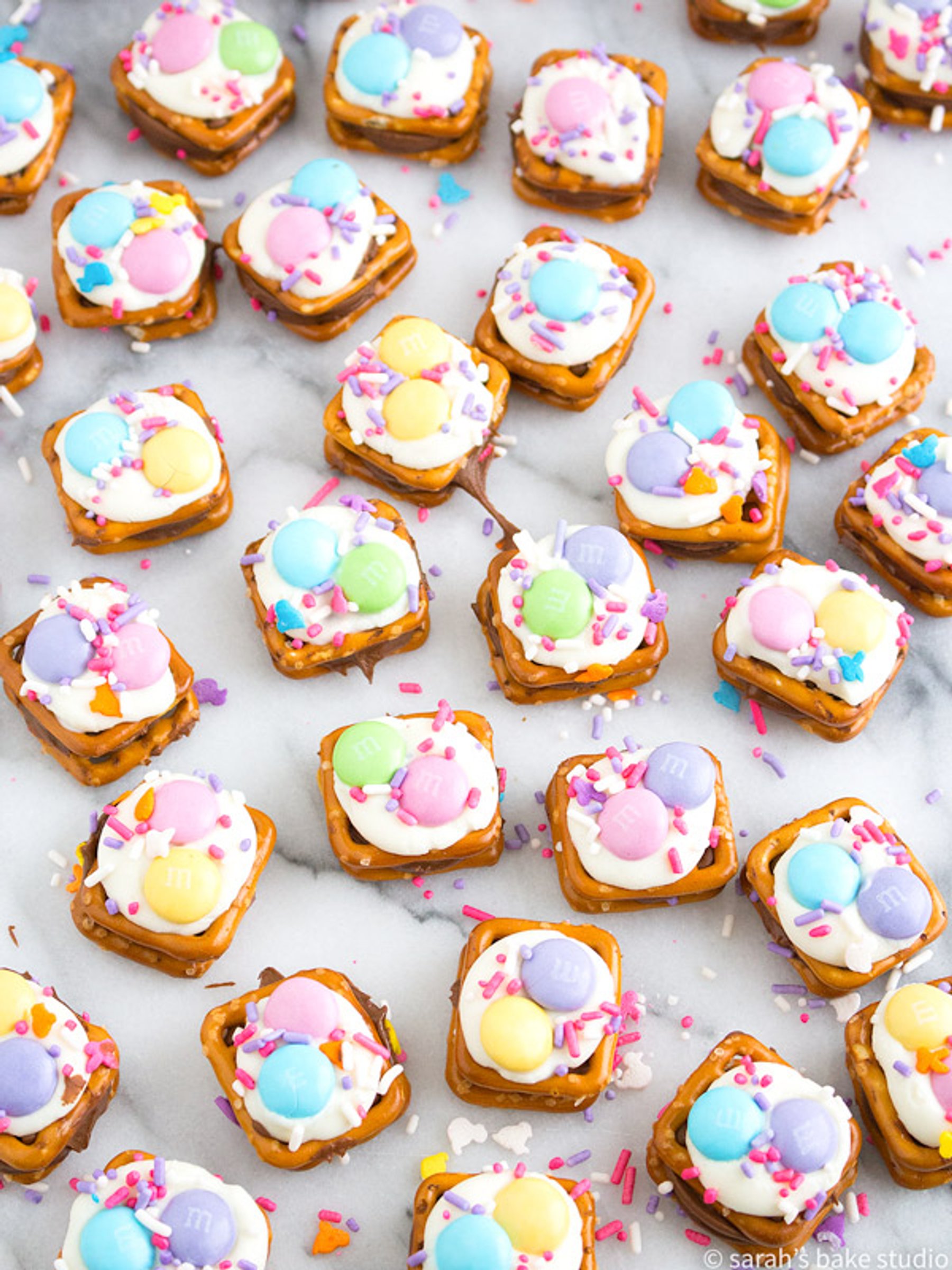 Spring Rolo Pretzel Bites – Rolo candies sandwiched between two pretzel snaps and topped with white chocolate, pastel M&M’s candies, and spring sprinkles; a perfect springtime delight!