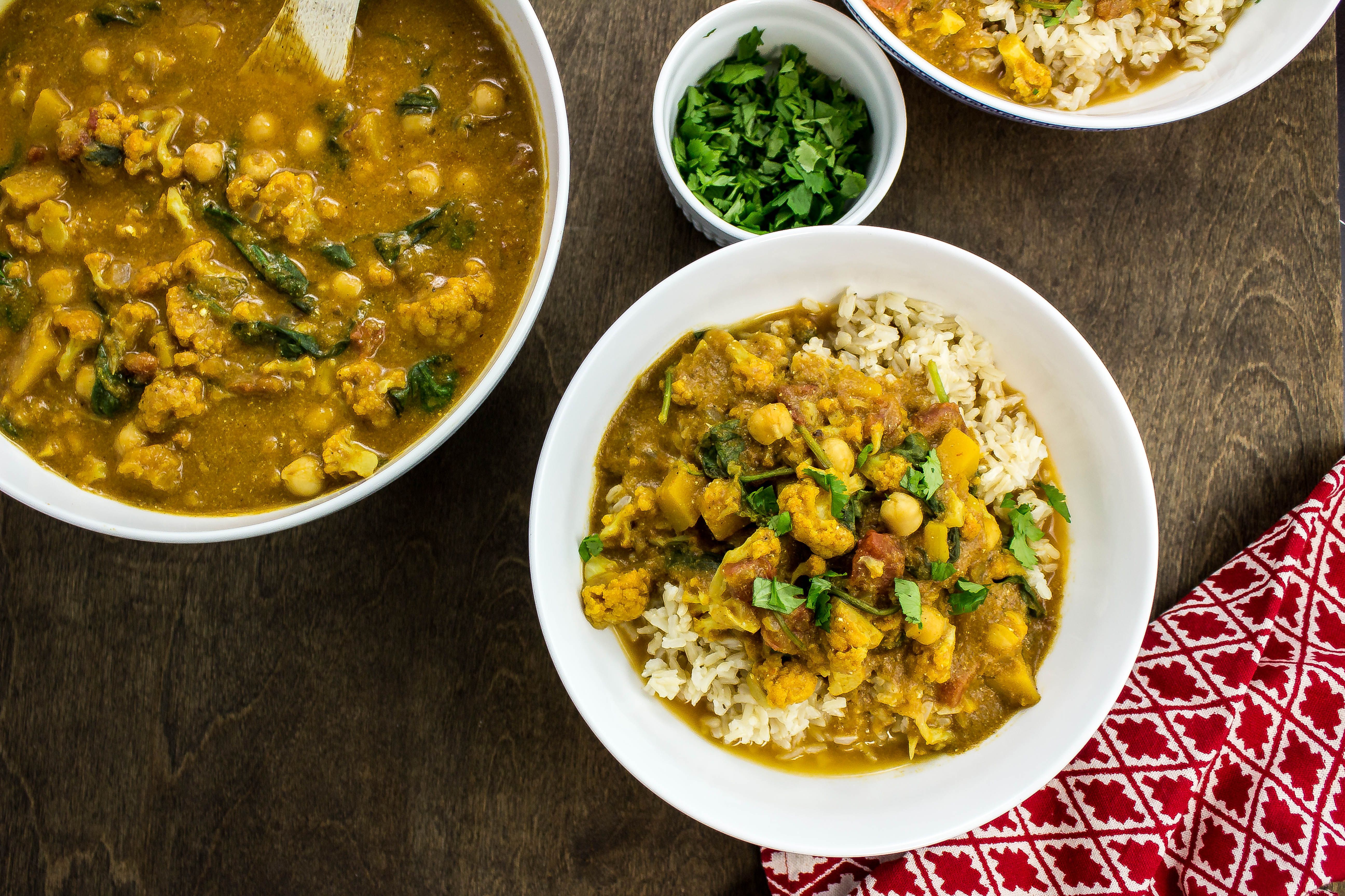 Squash & Vegetable Curry is a hearty dish packed with delicious Indian spices and vegetables. Roasted butternut squash, chickpeas, baby spinach, and cauliflower coated in a decadent tomato curry sauce. Great for meatless Monday and for a beginner to Indian food.