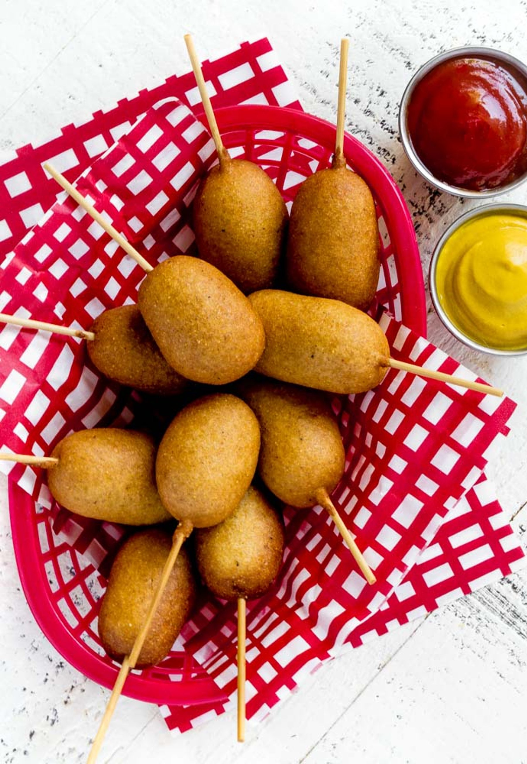 State fair corn dogs are golden and delicious. Make them in just 20 minutes! Serve mini corn dogs as party appetizers, or with fruit for a complete meal.