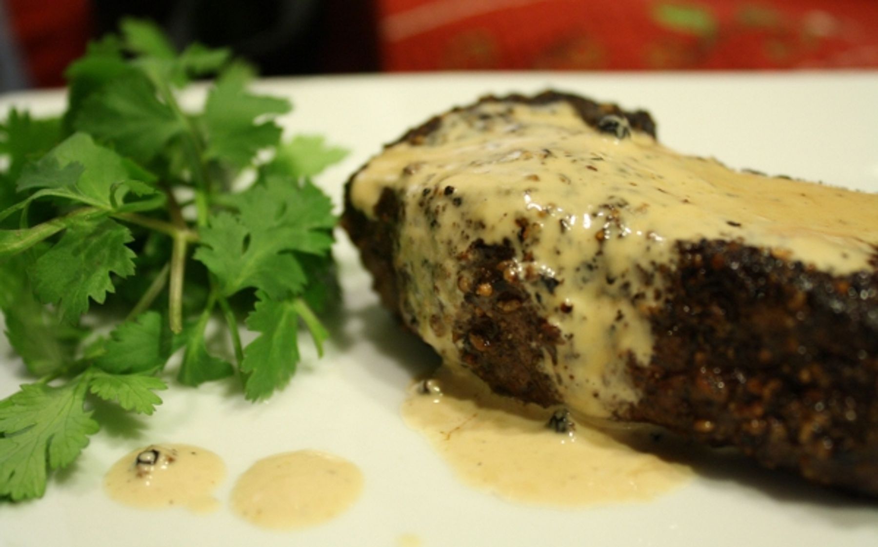 In a round pie tin spread the ground peppercorns. Coat both sides of...
