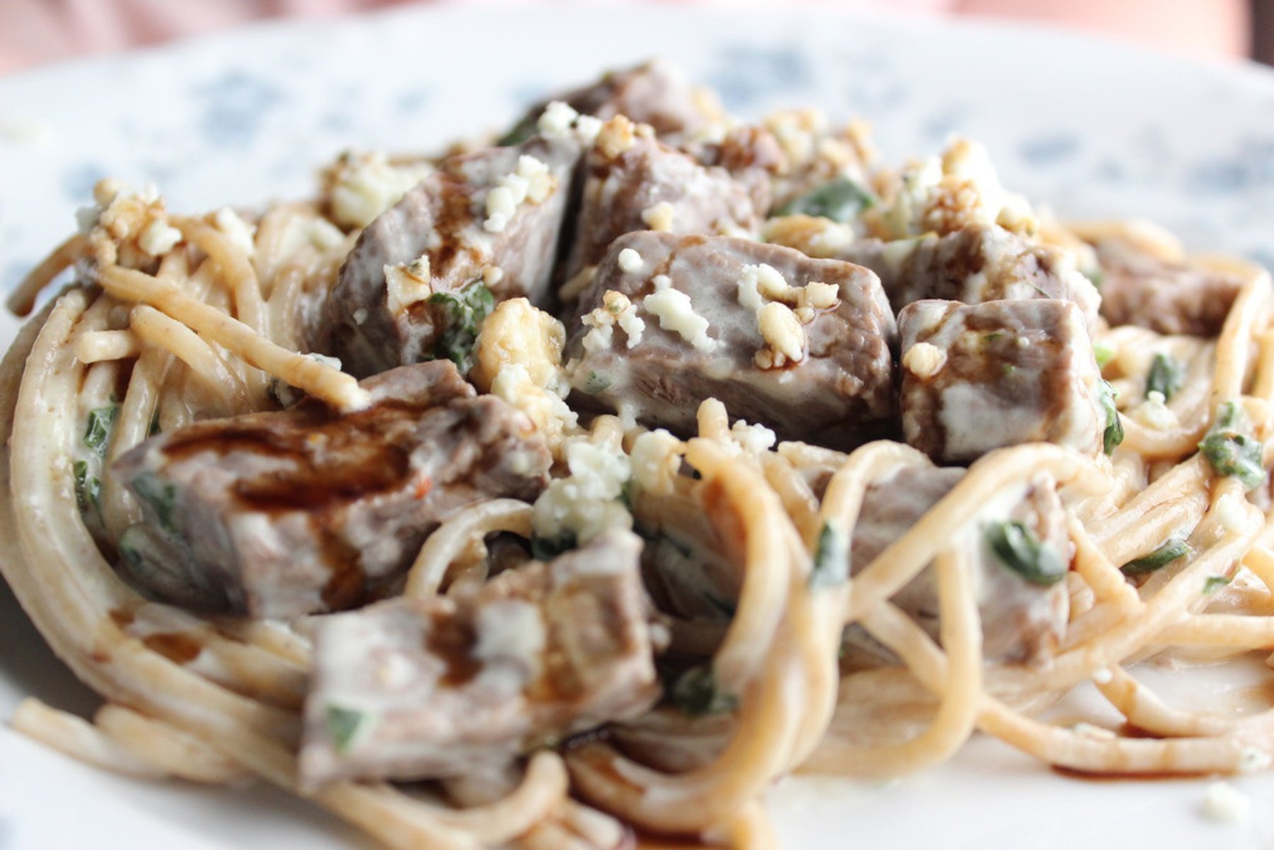This recipe features chunks of steak in a creamy gorgonzola sauce with fresh spinach, topped with a balsamic glaze that is out of this world delicious!