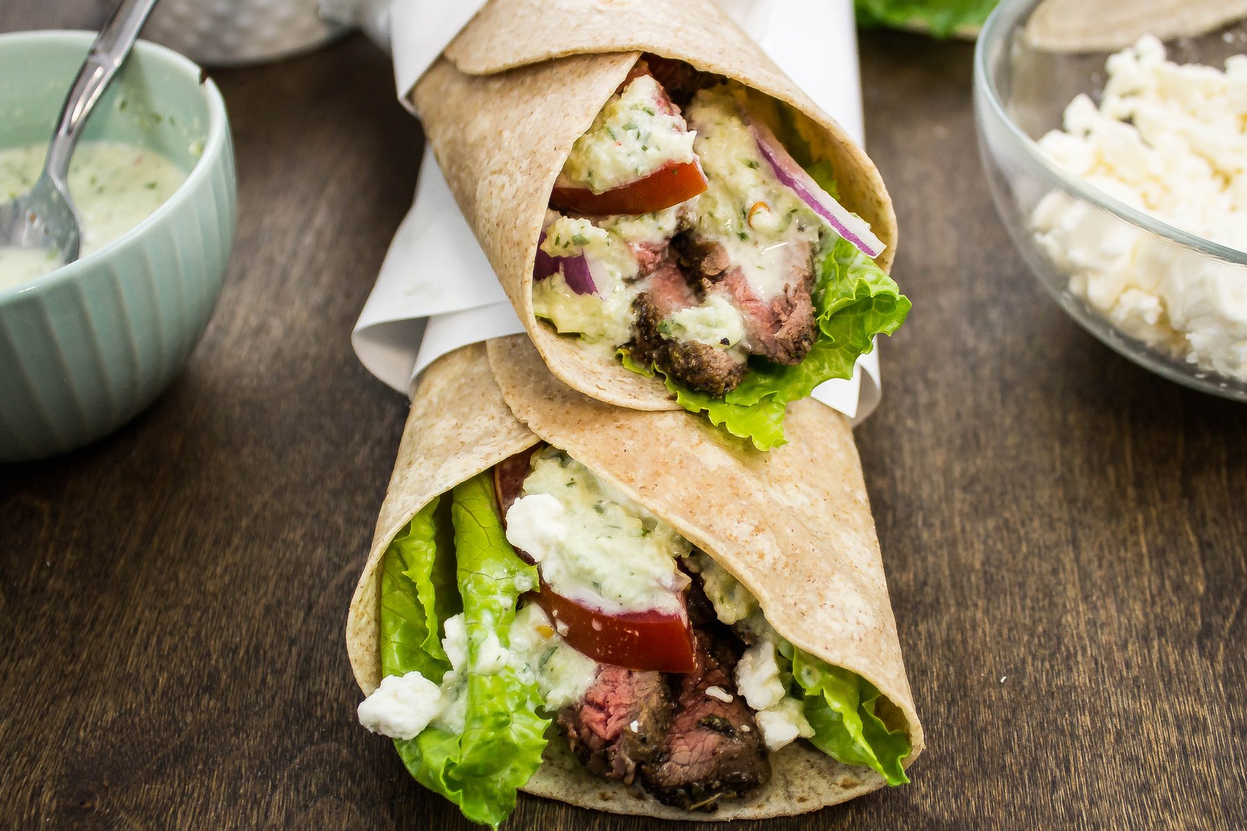 Steak Gyro Wraps-Seasoned grilled steak topped with tzatziki sauce, tomato, onion, lettuce, & feta cheese all wrapped up in a whole wheat wrap.