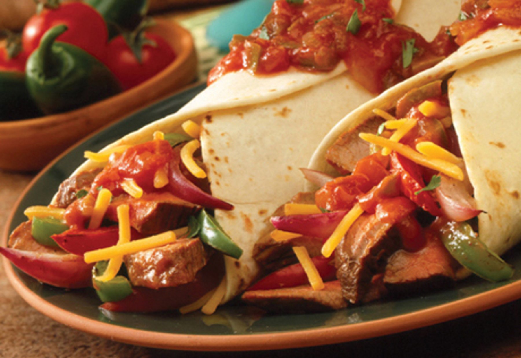 3 Slice the steak into thin strips and place down the center of each tortilla. Top with the pepper mixture and the cheese. Fold the tortilla around the filling. Serve with additional picante sauce.