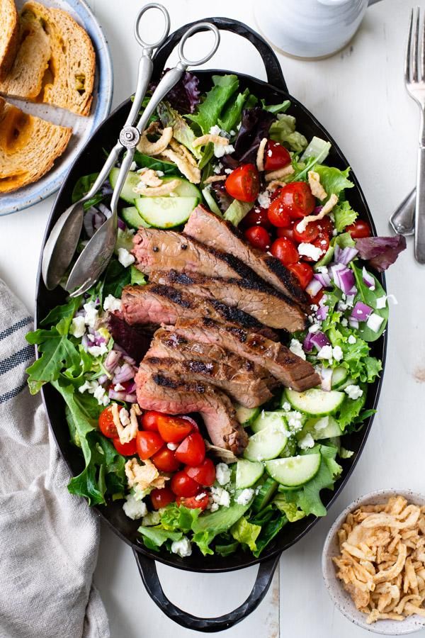 The best steak salad recipe includes marinated, grilled flank steak, fresh vegetables, crispy fried onions, crumbled blue cheese and a homemade creamy balsamic vinaigrette. It's light, flavorful and incredibly satisfying! Pair the entrée salad with a loaf of crusty bread for easy dinners all summer long.