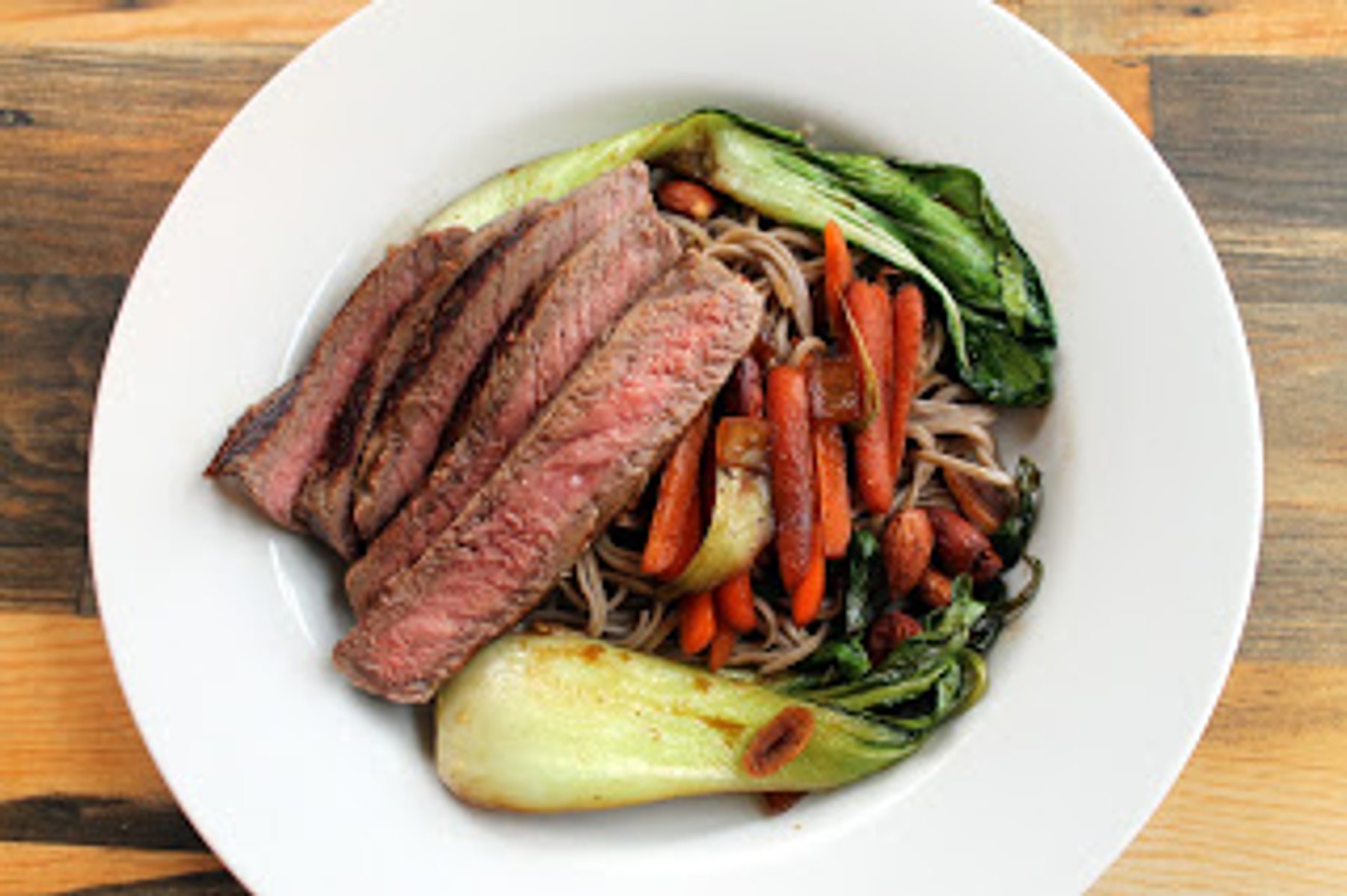 Cook soba noodles according to package instructions and set aside. Generously season steak with salt and pepper, and placed in a greased skillet over medium high heat. Cook 4-6 minutes per side, or until...