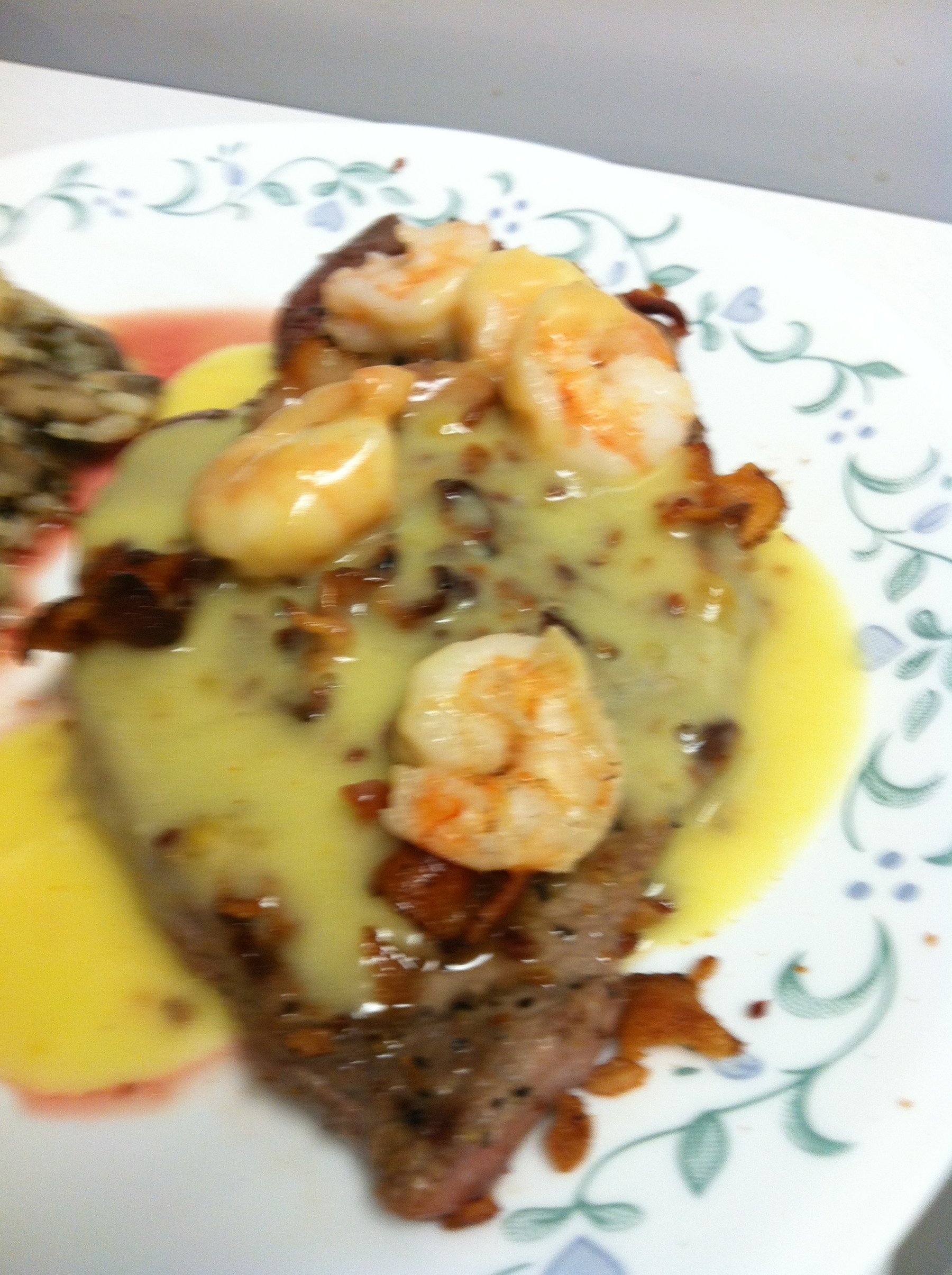Steak with shrimp and hollandaise sauce.