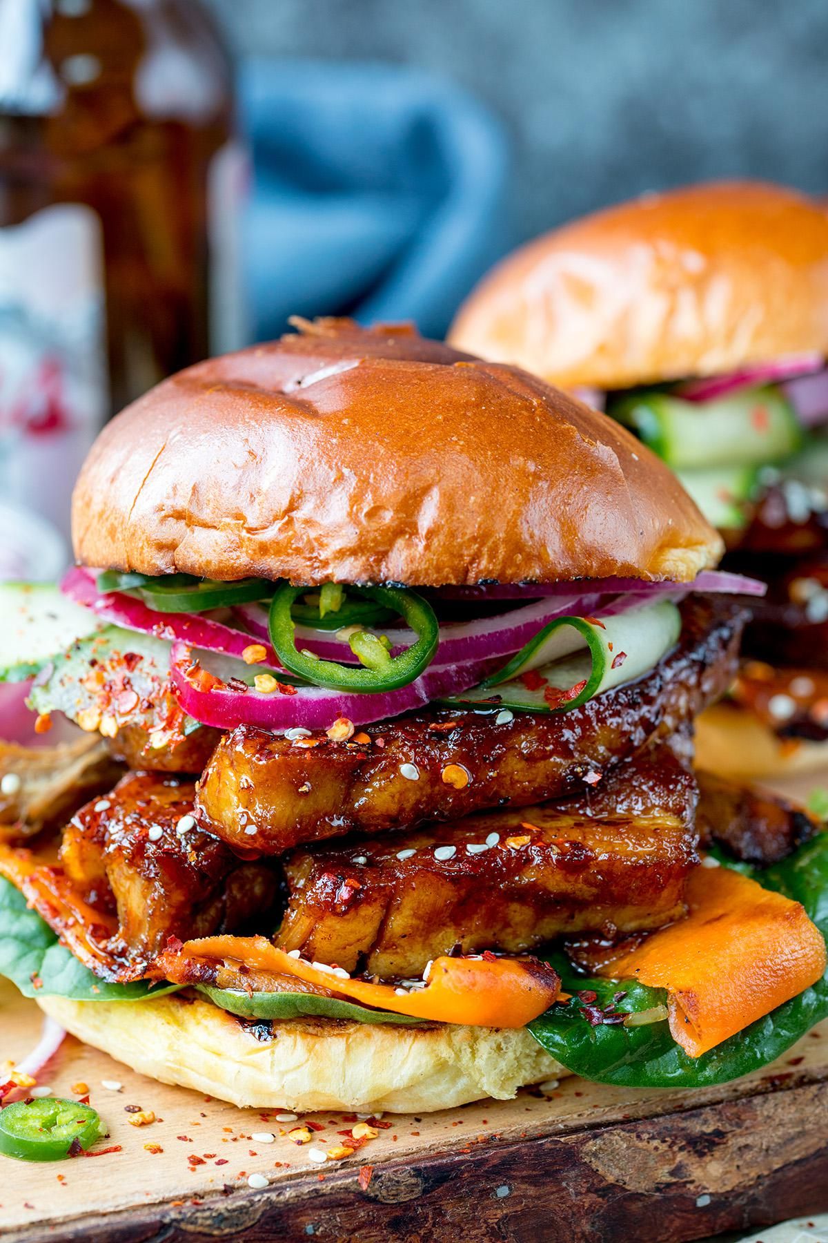 Sticky, spicy, melt-in-the-mouth pork belly, stuffed into a soft brioche bun and loaded with quick pickled veggies and a jalapeno kick!