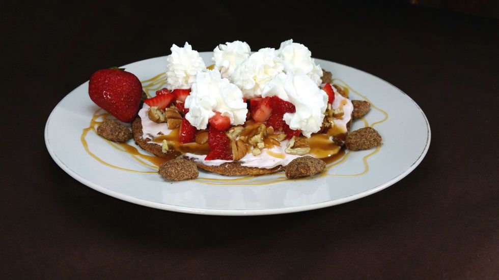 If you love cinnamon this Sticky Dessert Tostada is for you. It's crispy, creamy, fruity and sticky. Experiment with different fruit flavors for a change.