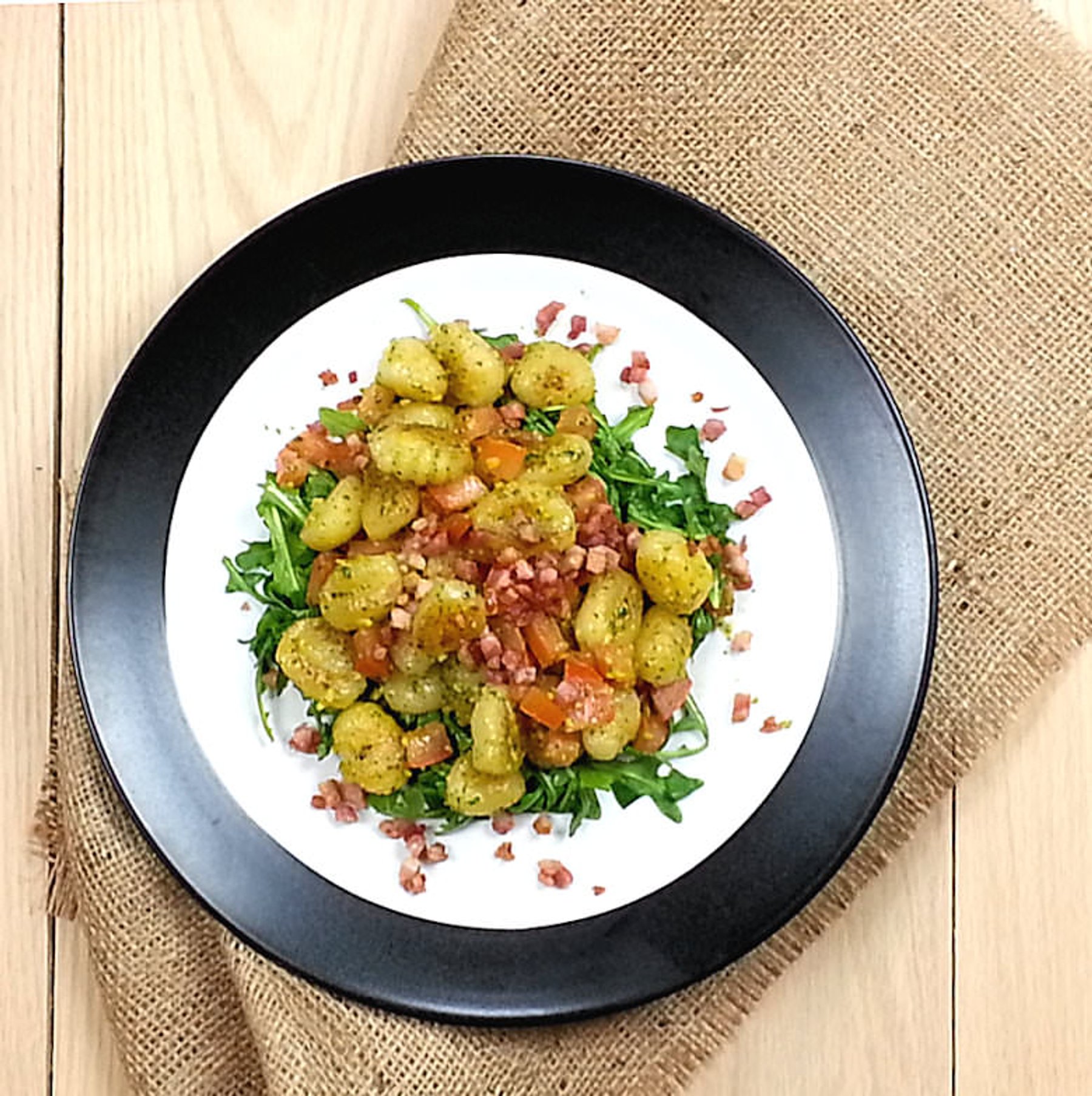 Stir-fried Gnocchi with Arugula and Pancetta. The bitterness of the arugula, the crunch of the pancetta, the softness of the gnocchi make a delicious meal.