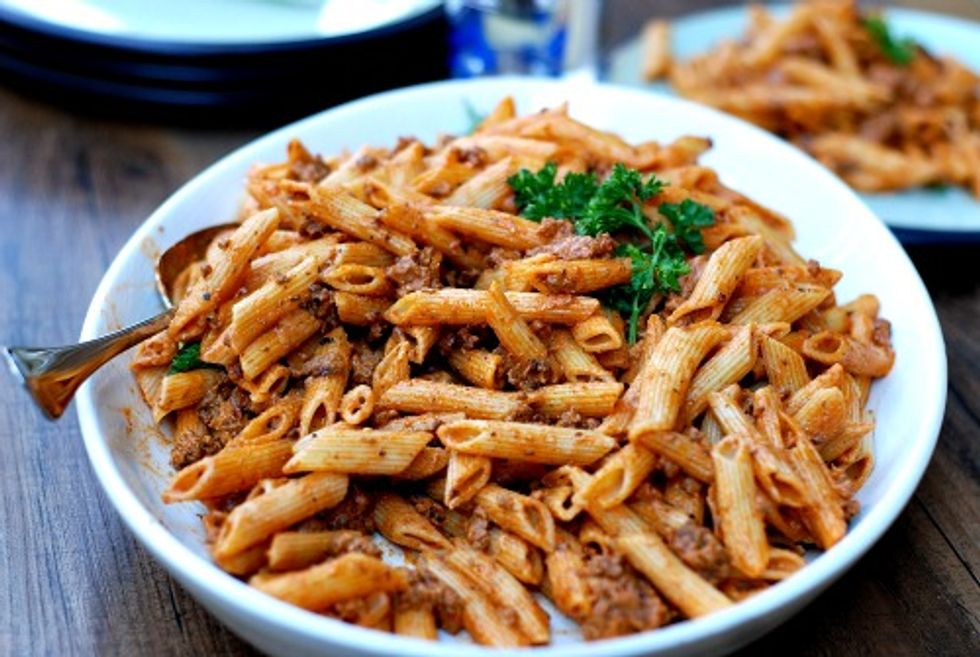 Prepare pasta according to package direction. Heat ground beef in a large skillet until browned. Add onions and garlic and cook another 2 minutes until meat is no longer pink. Stir in tomato paste, salt,...