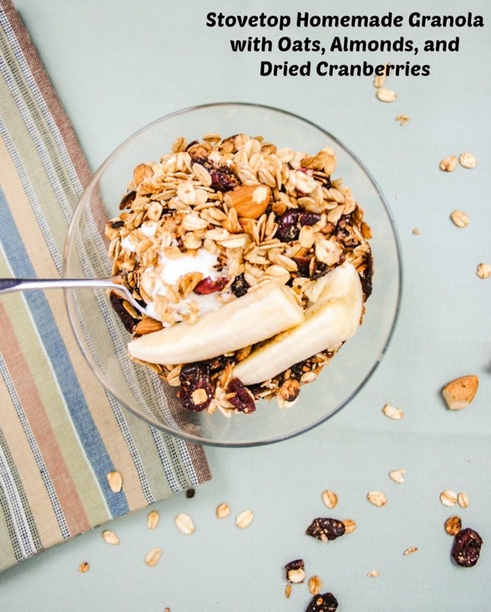 This homemade granola with oats, almonds, and dried cranberries toasts up quickly on your stovetop and makes a terrific topping for your favorite Greek yogurt.