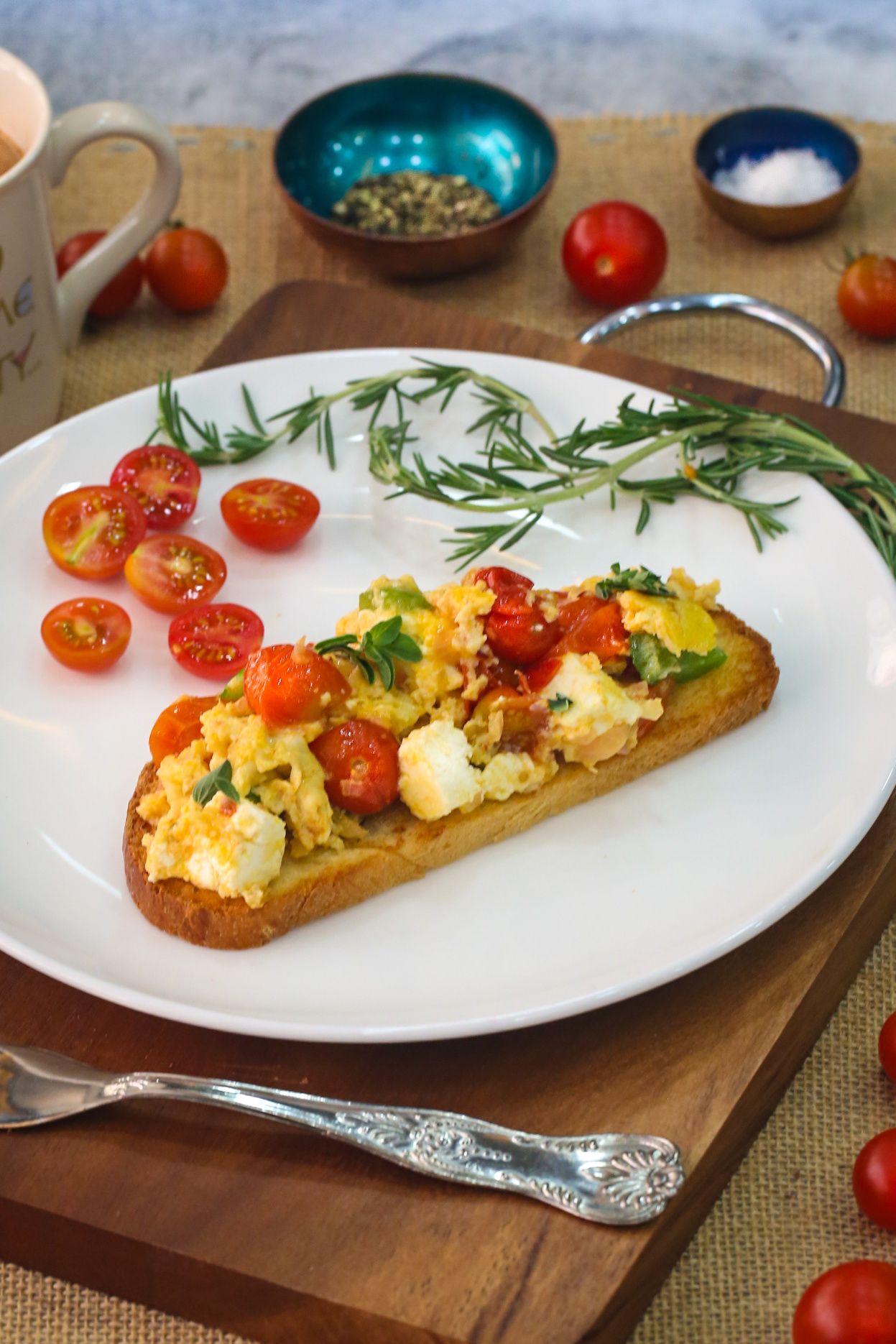 Delicious and easy traditional Greek scrambled eggs with juicy baby tomatoes, feta cheese, peppers, and fresh oregano, which make an ideal Sunday brunch dish for both family and friends. My personal favourite!