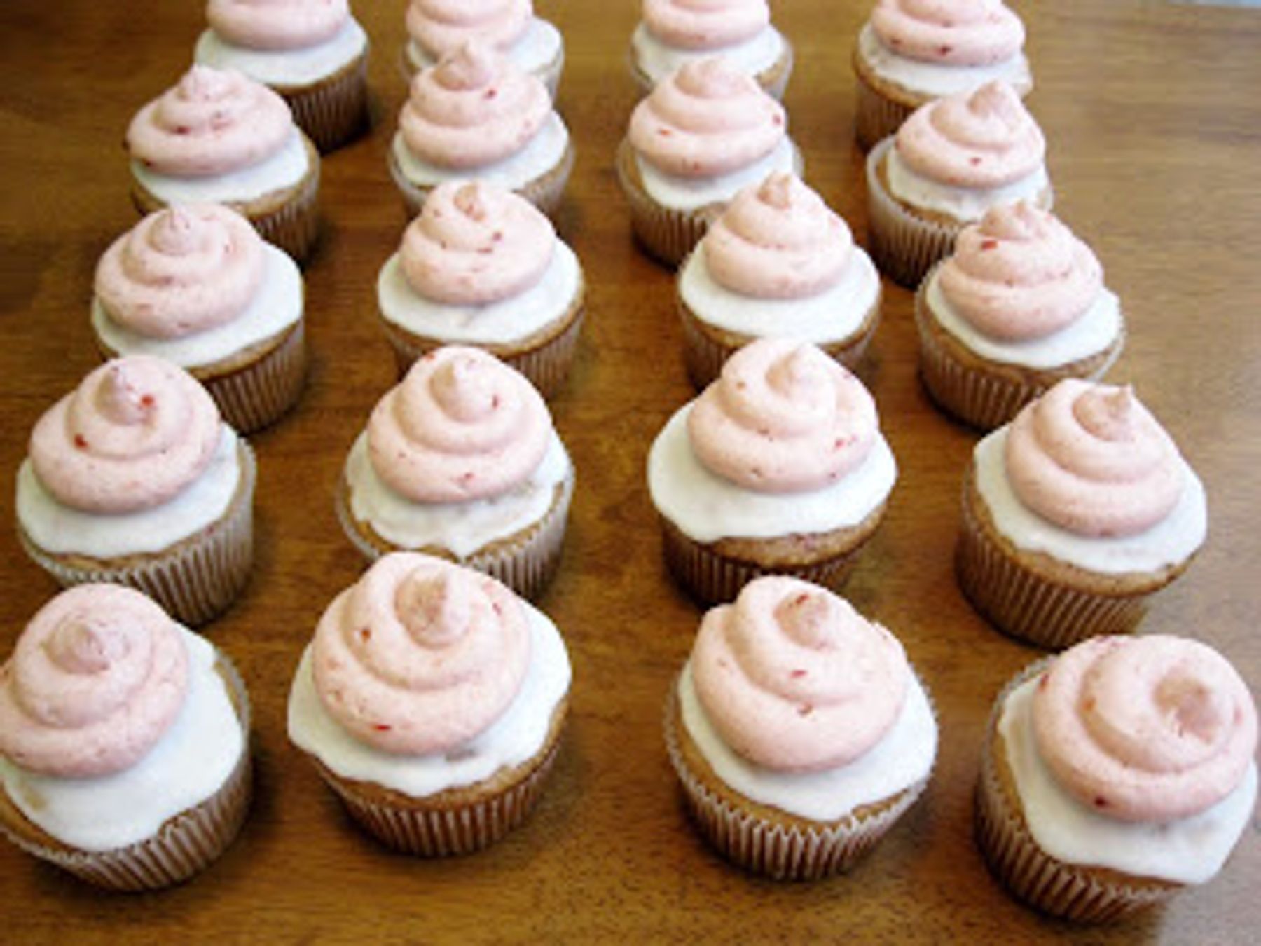 These are fun little cupcakes for Valentines day, spring time or just because. Use fresh berries to make a delightful treat. The buttercream frosting is ridiculously good. It's almost like eating strawberry ice cream.