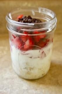 - In a mason jar or sealable container, add the oats and milk. Then add in the greek yogurt, strawberries and then chocolate chips.