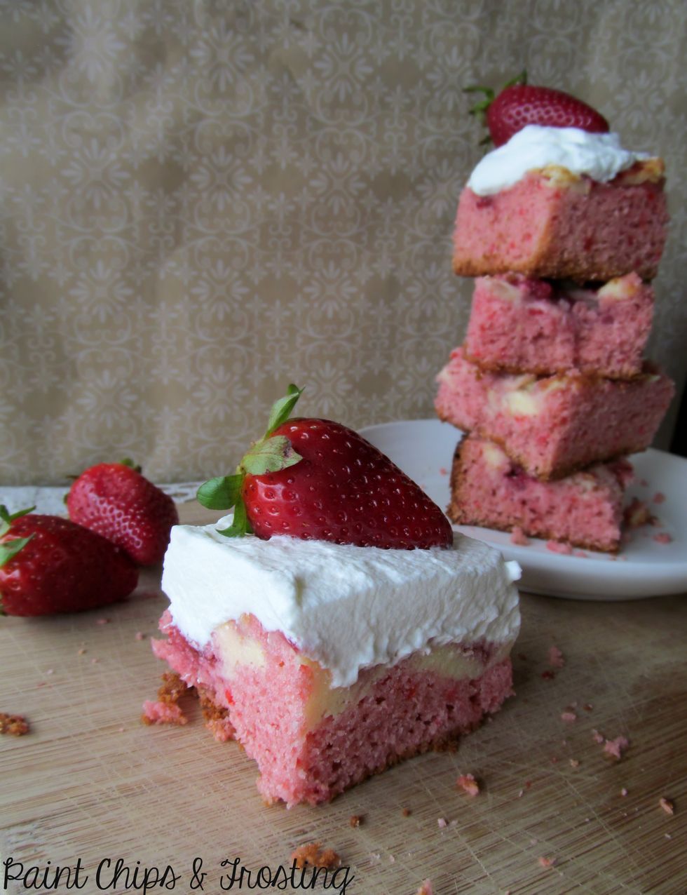 Strawberry cake mix blondies topped with cheesecake and a fresh strawberry jam swirl!
