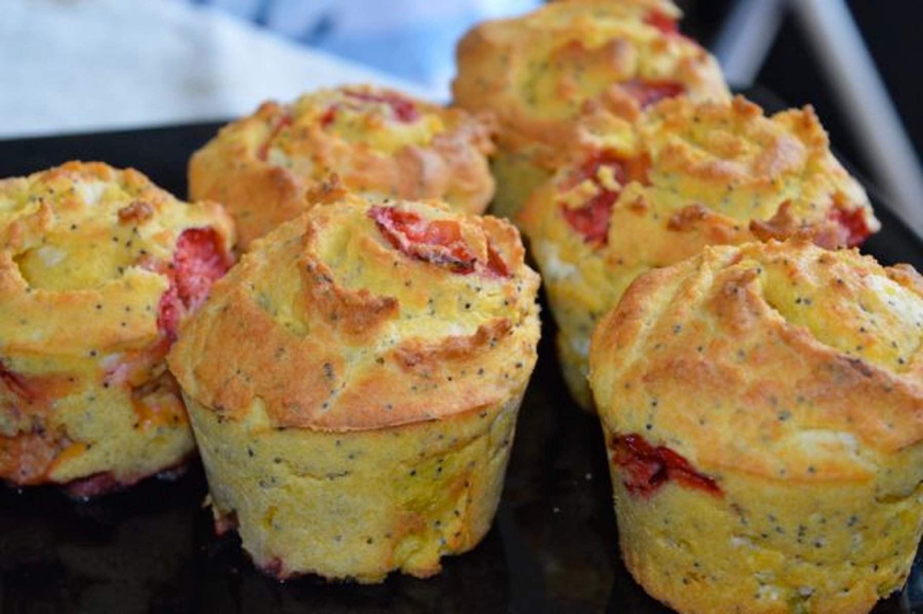 Savoury cornmeal muffins with strawberries, feta cheese and poppy seeds.