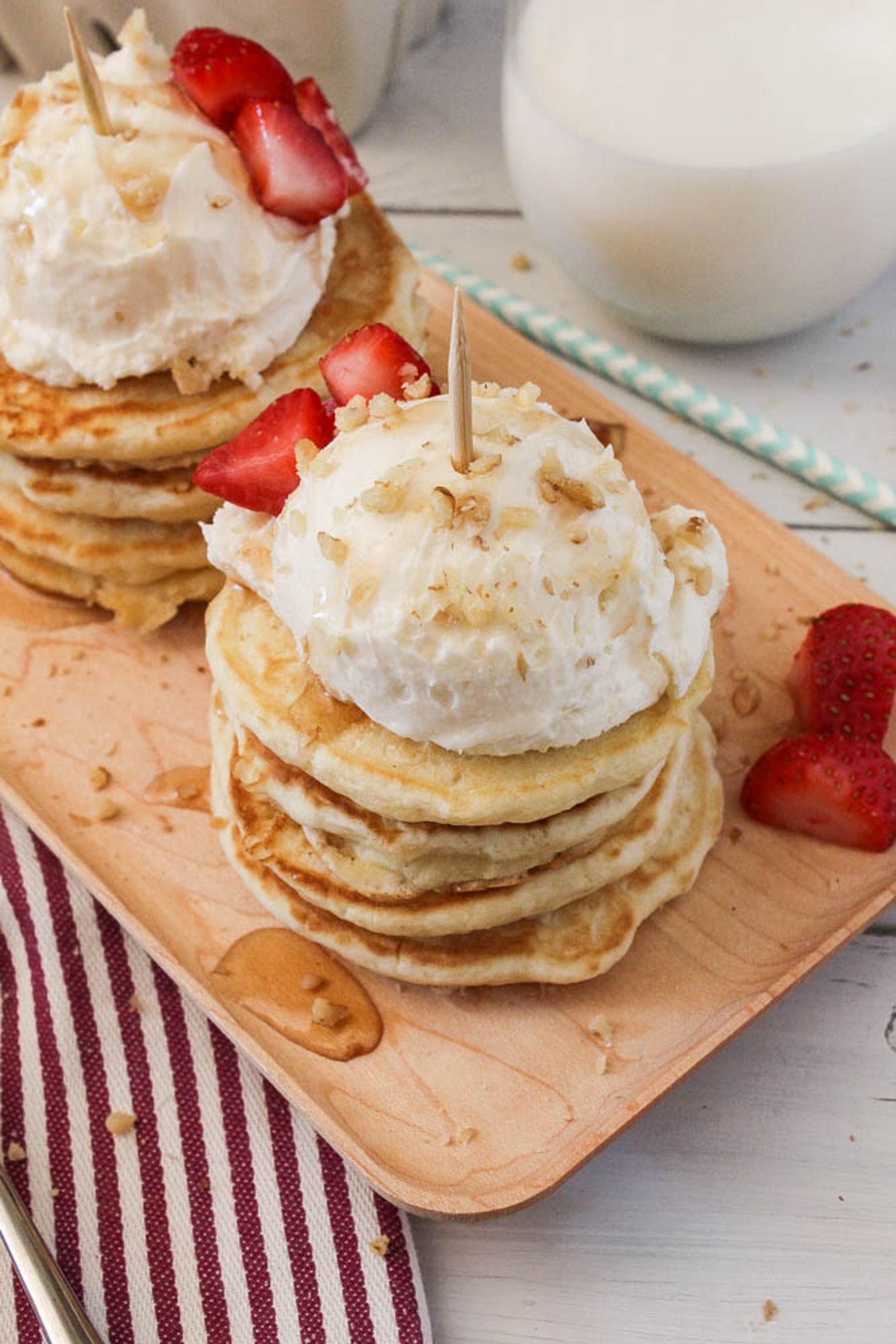 Mini pancakes with whipped cream, fresh cut strawberries, sprinkled with crushed walnuts and drizzled with maple syrup! Perfect for your little mini or a fun brunch with the girls!