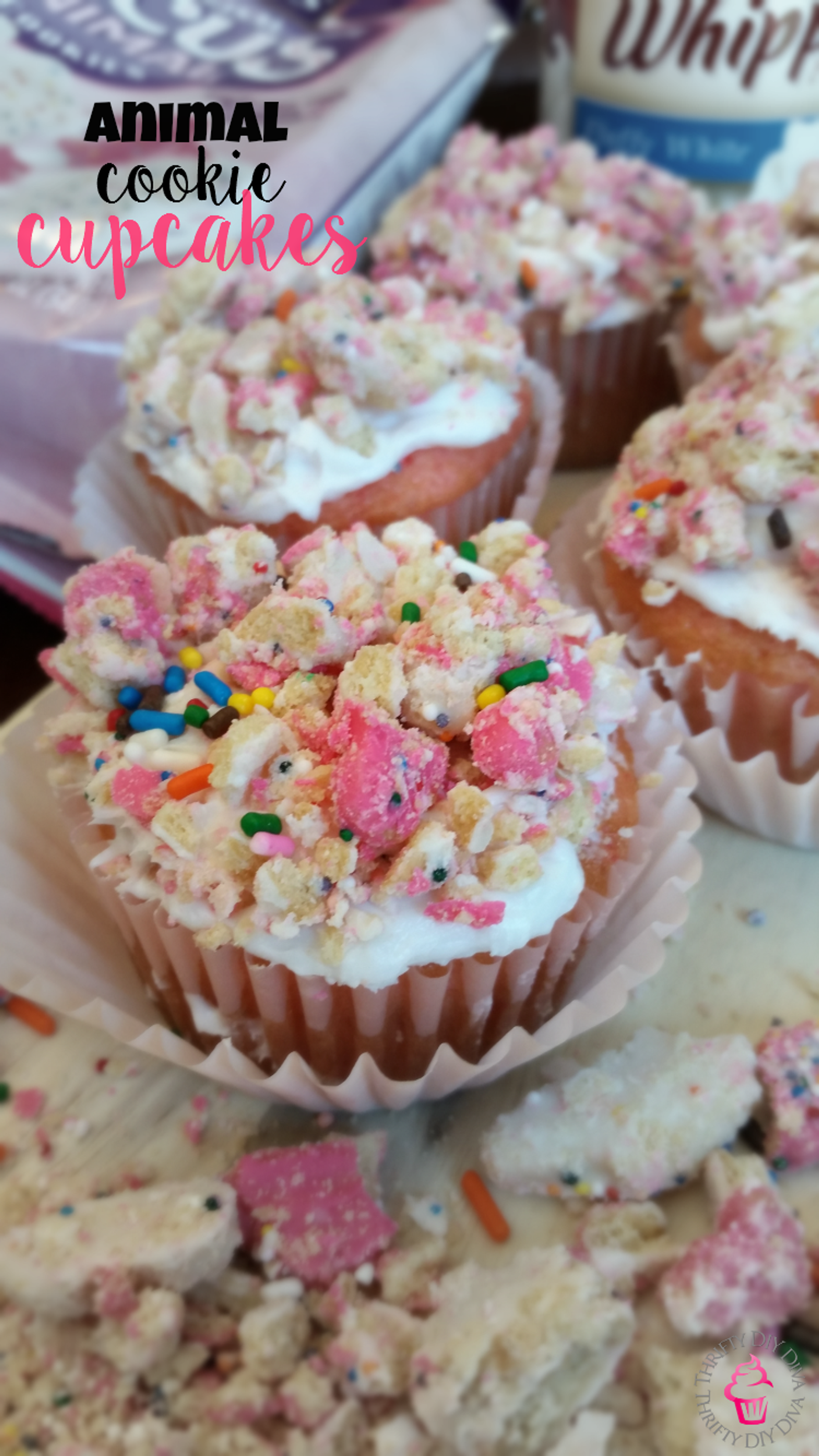 Prepare the cupcakes and let cool completely before frosting. Smash 3/4 of the bag of animal cookies in a plastic bag and sprinkle the crumbs on top of each cupcake!