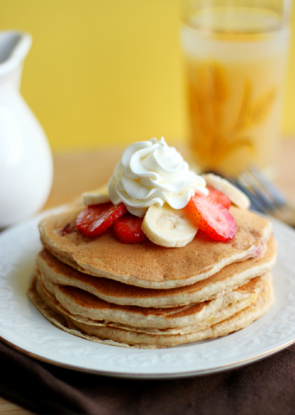 In a medium-sized bowl, whisk together flours, baking powder, and salt. Set aside.
