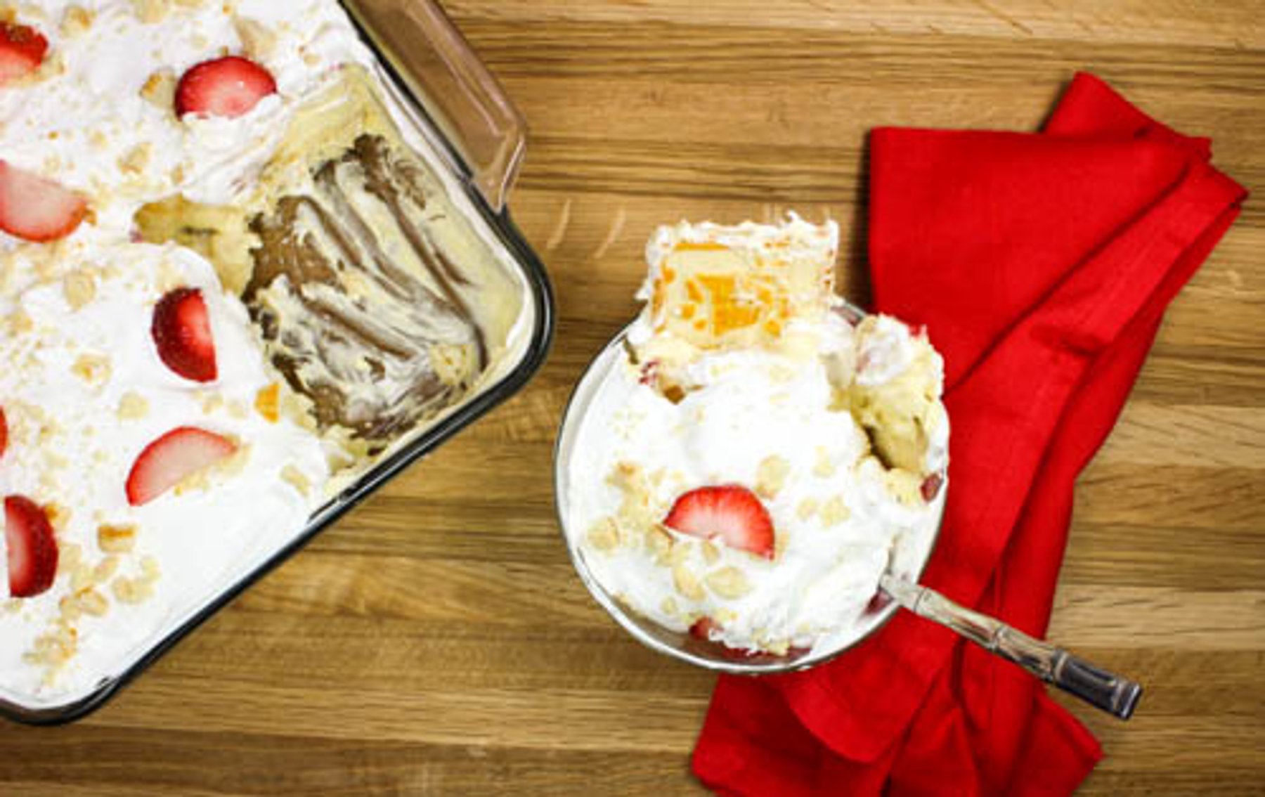 Strawberry Banana Pudding-Decadent layers of cookies, fresh bananas & strawberries, sweet pudding, topped with cream. No fuss, no bake!