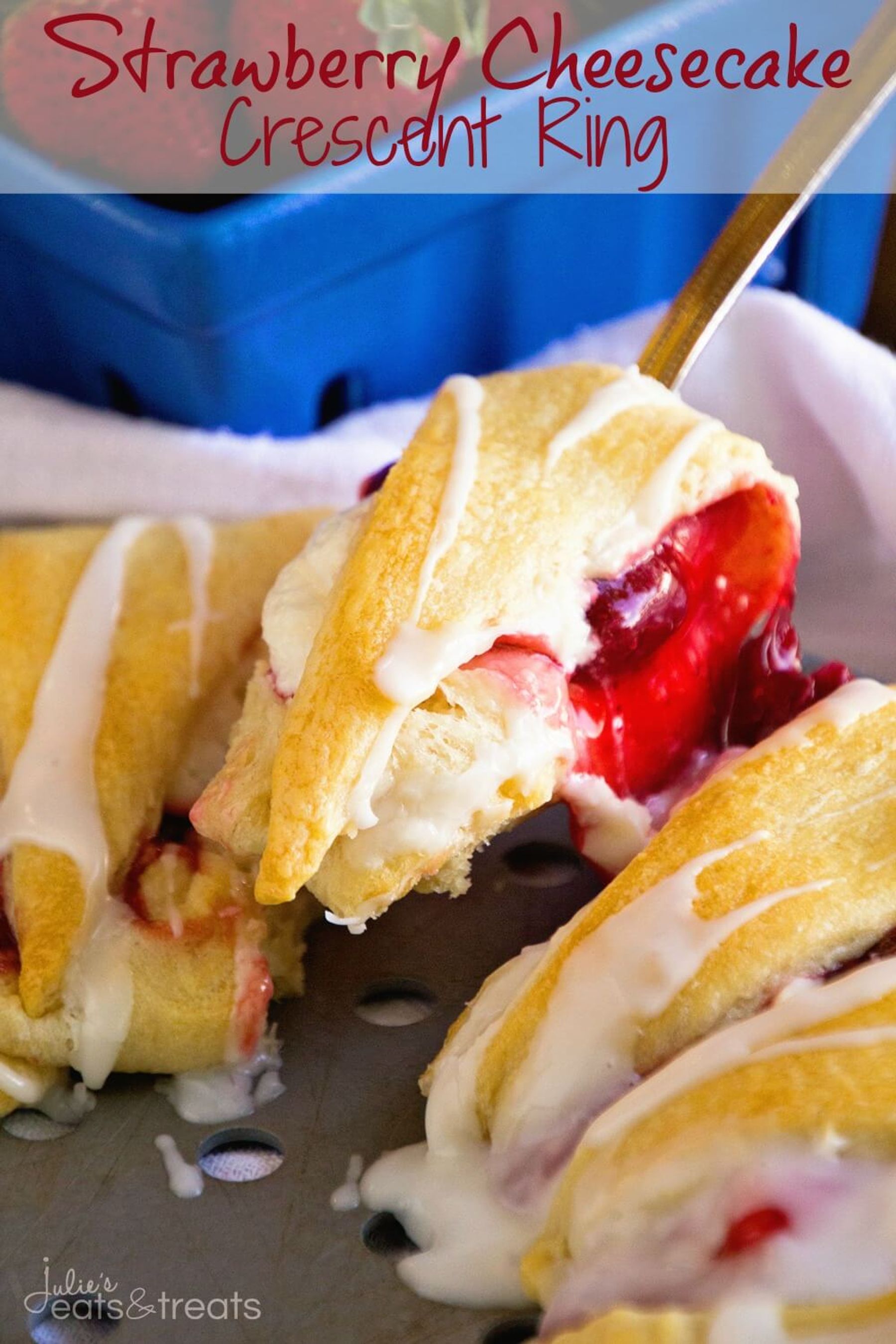 Strawberry Cheesecake Crescent Ring ~ Tender, Flaky Crescent Rolls Stuffed with Strawberry Pie Filling & Cheesecake then Drizzled with Icing! Perfect Quick & Easy Breakfast Recipe!