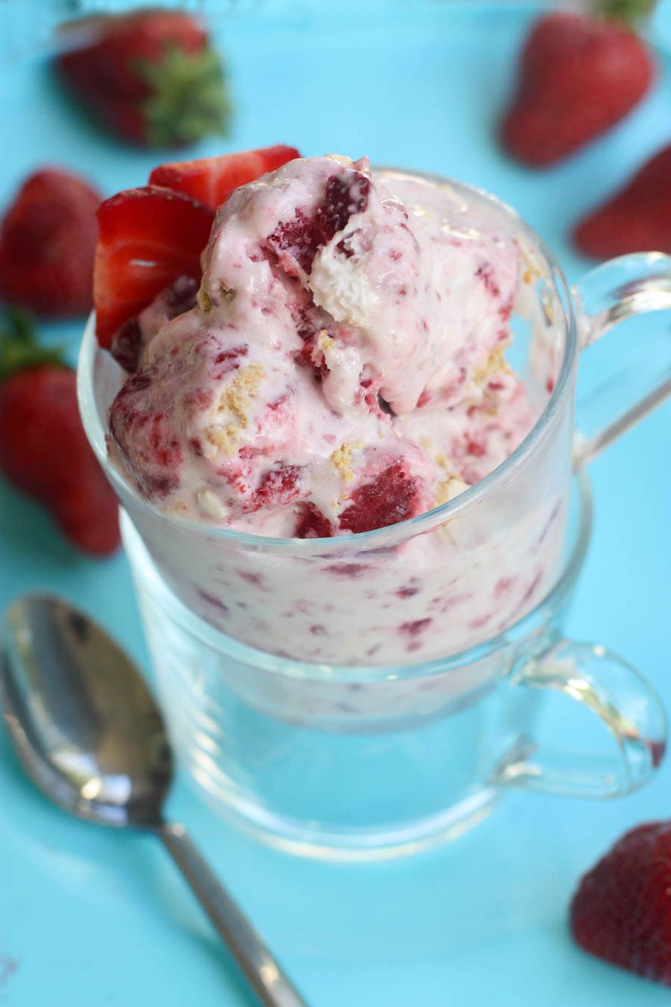 his Strawberry Cheesecake Ice Cream couldn’t be yummier or easier! No churn, no ice cream maker needed, with bits of fresh strawberries and graham cracker crumble.