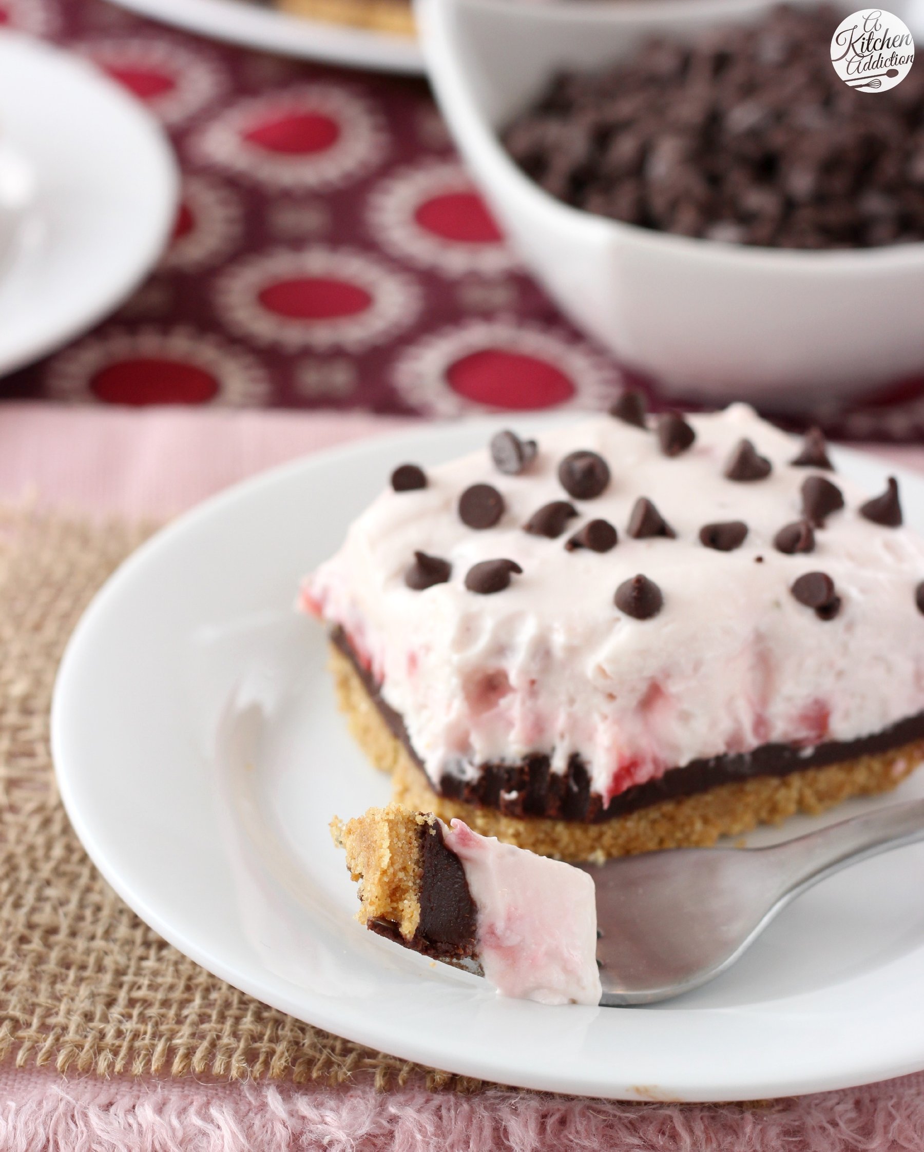 Sweet strawberry cheesecake sits atop a layer of rich, creamy ganache!