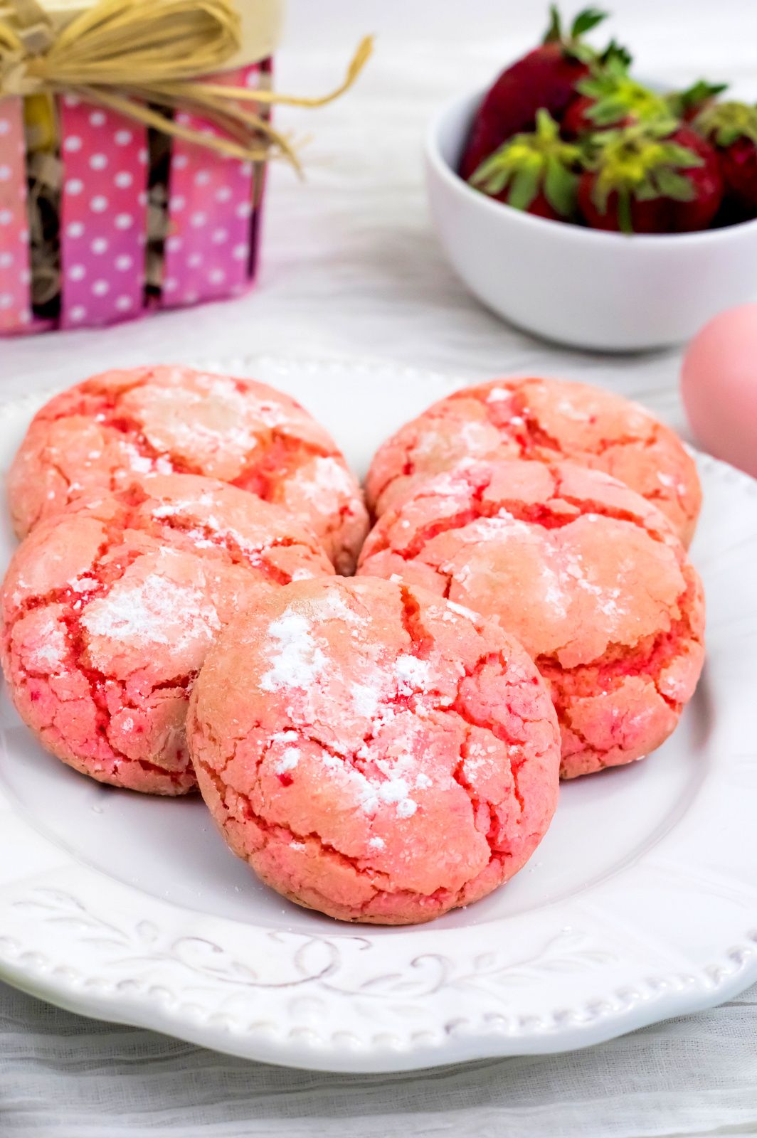 Strawberry Crinkle Cookies are amazingly easy to whip up and are the best right out of the oven. I always snag one off the sheet pans since once my kids notice I made cookies, that will be the only one I end up getting.