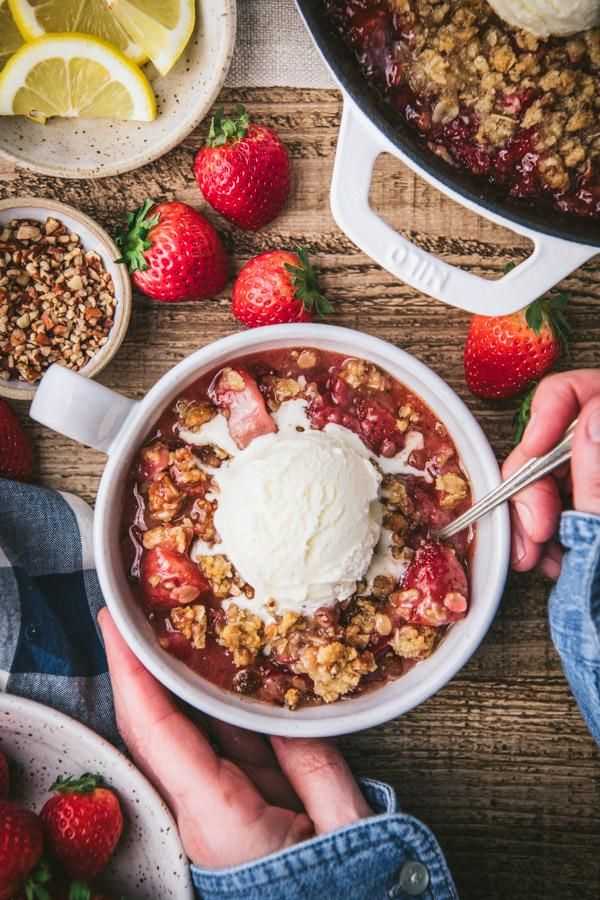 This easy strawberry crisp recipe is the perfect way to enjoy a bounty of fresh berries! Juicy, sweet strawberries are topped with a buttery, crunchy oat streusel for a classic spring or summer dessert that everyone loves. Bake the crisp in a skillet or in a dish, and serve warm with vanilla ice cream on top!