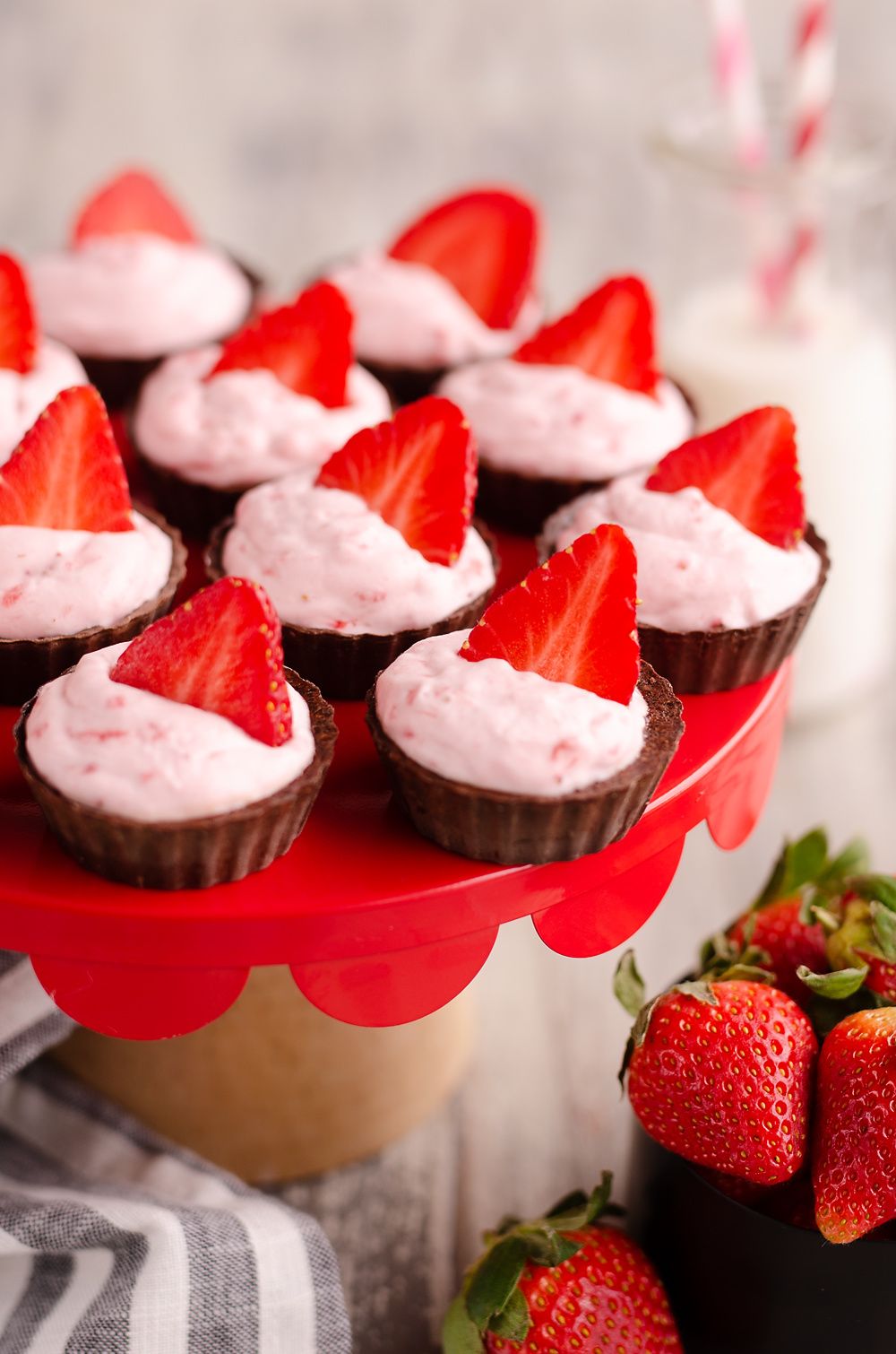 Strawberry Dark Chocolate Mini Dessert Cups are a quick and easy 10 minute recipe with 4 simple ingredients and only 125 calories for a light treat. They are a finger food perfect for your next party's dessert table.