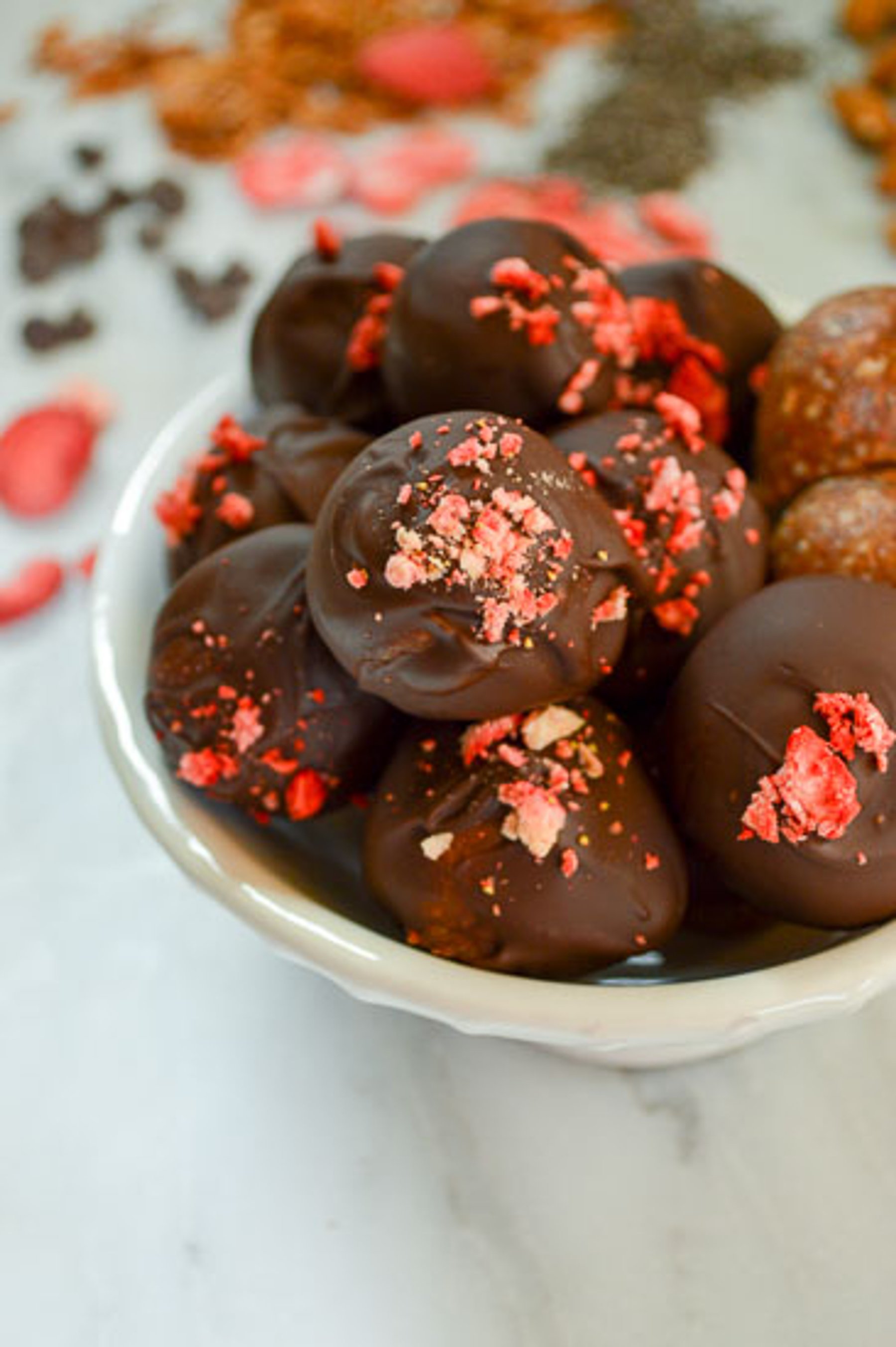 In a food processor, insert pitted dates and almonds and pulse to break up a bit. Note: if they are large dates you may only need 8.