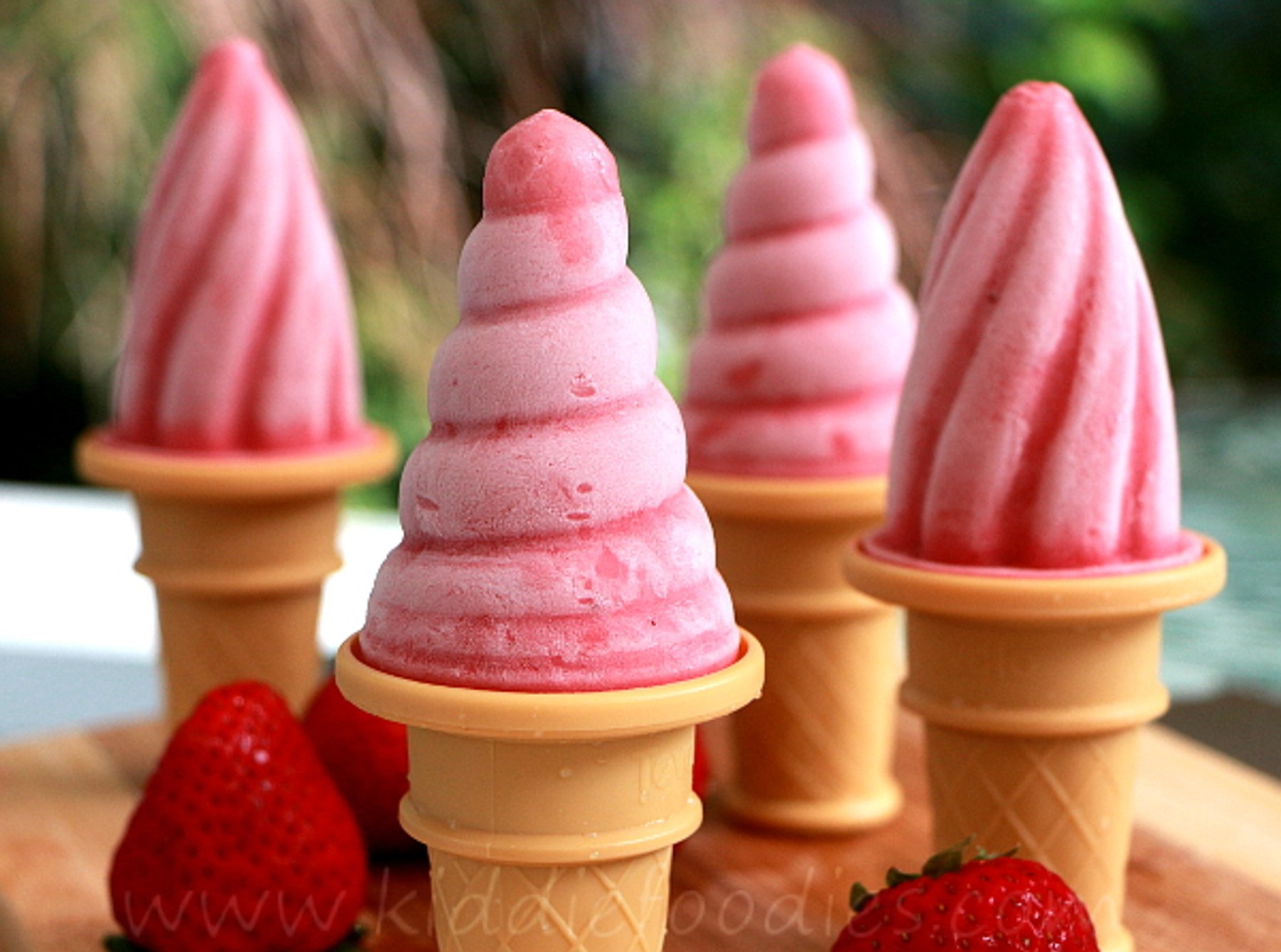 Homemade ice cream pops, made of strawberry, frozen yogurt and agave syrup. Great cold summer treat that the whole family will love. Easy Popsicle recipe.