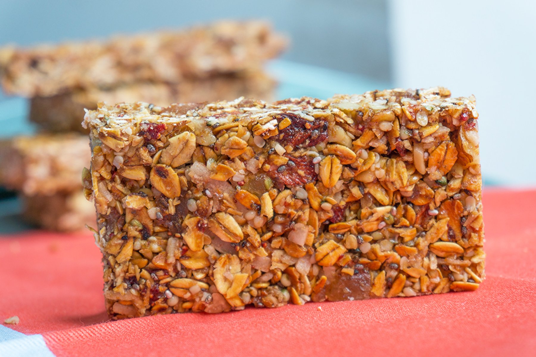 Strawberry-Ginger Granola Bars are full of delicious, good-for-you ingredients. They make an excellent snack for the trail, the office or just lounging at home with a good book.