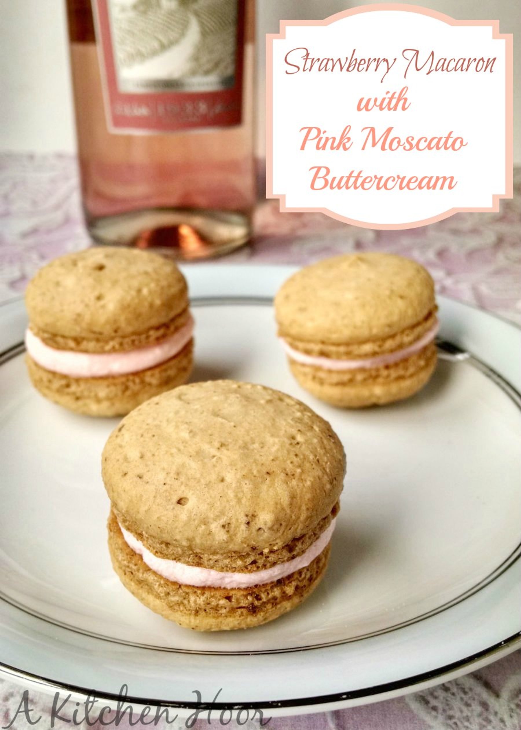 Freeze dried strawberryes flavor the shells while Pink Moscato wine flavors the buttercream filling. YUM!