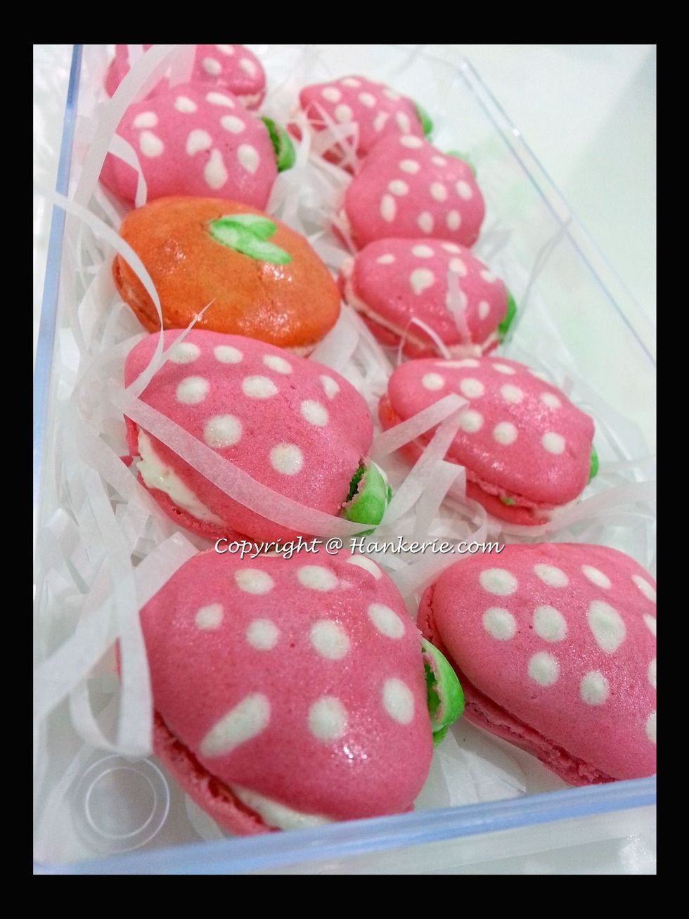 I am just too tired to make the normal conventional shape of macarons. Out of sudden, strawberry spring into my mind, and here you go. I've made them into strawberry shape and 1 more tangy mandarin orange shape. But they were too cute to eat.