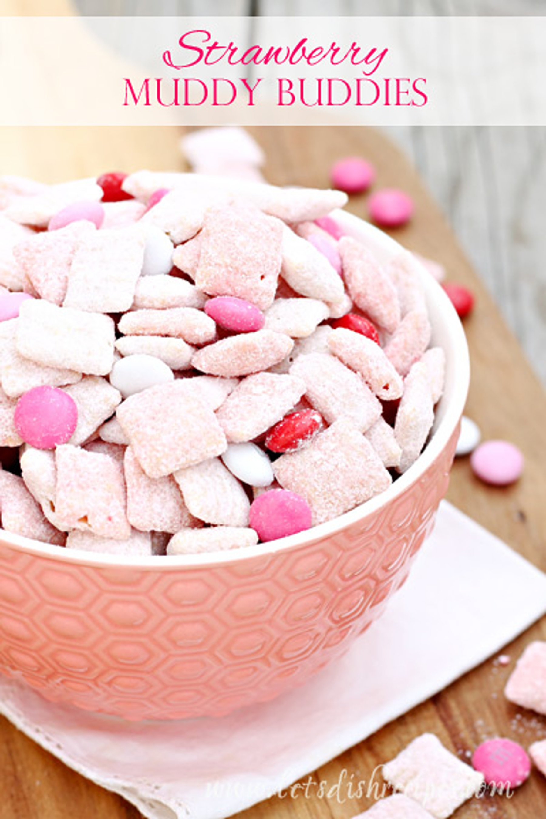 Strawberry flavored Muddy Buddies with chocolate candy pieces.