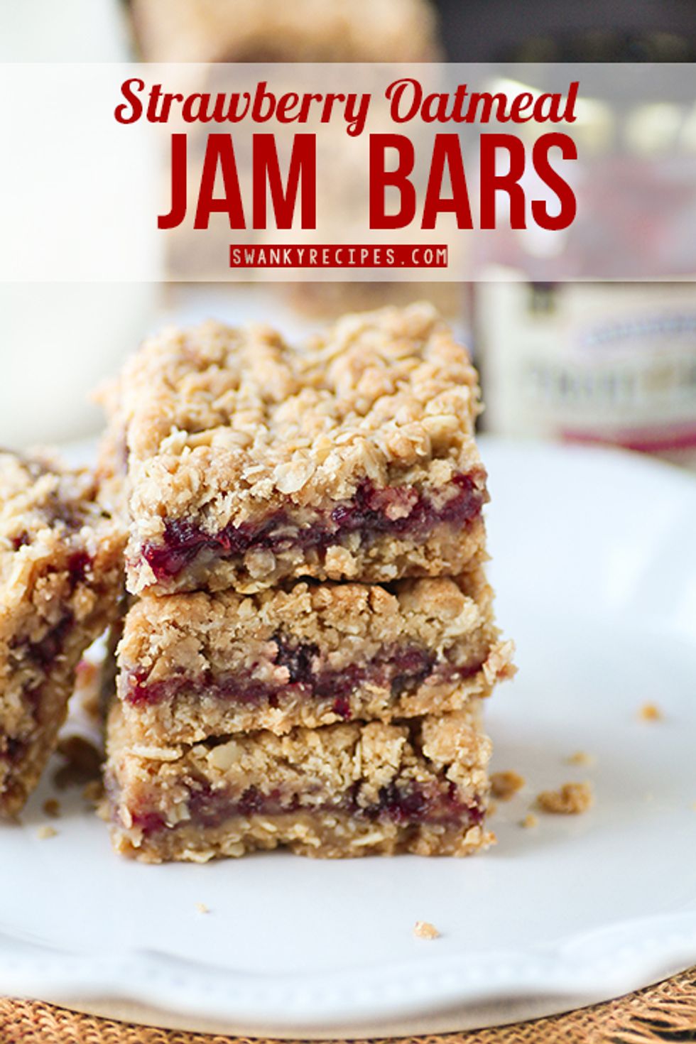 Crumbly strawberry oatmeal jam bars just like Grandma used to make. Delectable oat crust on the bottom and top with a layer of strawberry jam filled in the center. Enjoy for breakfast, snack or dessert. Make ahead and enjoy all week.