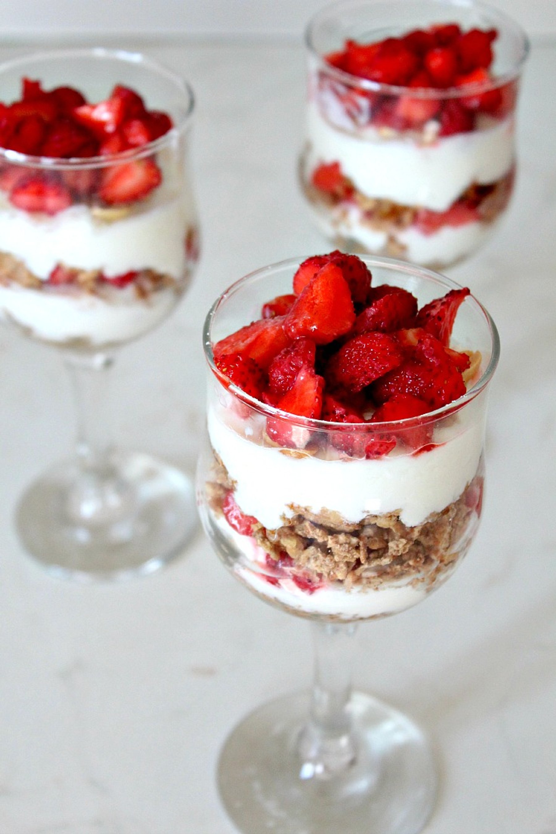 This light, creamy parfait layered with fresh strawberries is perfect for a summertime breakfast, a healthy snack or dessert if you add a bit of honey. It\\\'s also a quick fruit dessert that can be perfect for a romantic dinner for two with no leftovers to worry about.