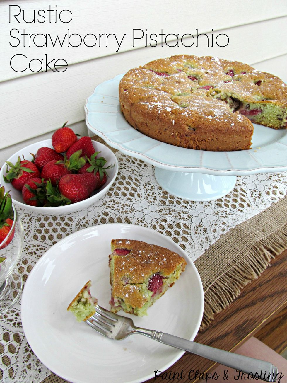 A rustic strawberry pistachio cake full of fresh strawberries and crunchy pistachios, topped with a light dusting of powdered sugar. This simple and elegant dessert will wow any crowd!