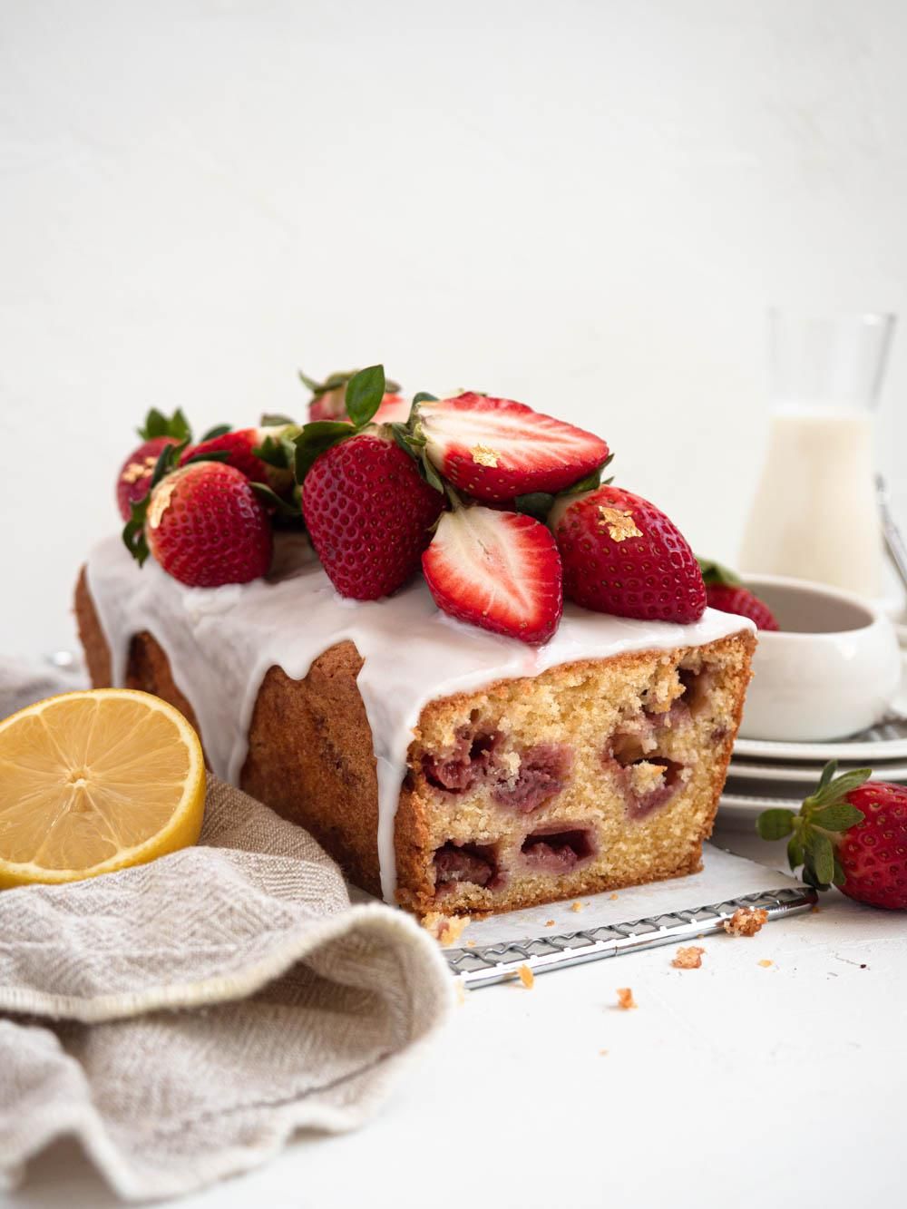 This strawberry pound cake is moist and buttery, studded with pockets of fresh strawberries and topped with a sweet and tangy glaze. Topped with fresh strawberries this cake is the definition of fruity!