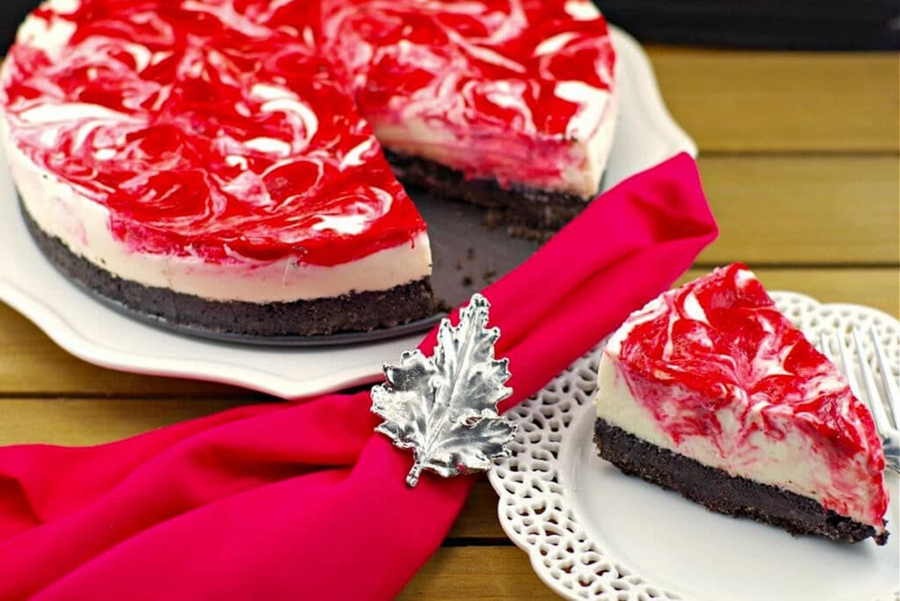 This NO BAKE Strawberry Rhubarb Cheesecake with white chocolate, is red and white so it's the ideal Canada Day dessert! It's also a lighter cheesecake, boasting a dark chocolate Oreo cookie crust, coupled with a rich, creamy white chocolate and red rhubarb strawberry marble filling. Fennel gives it a unique and subtle hint of licorice. And all of this in 30 minutes and without even turning on your oven!