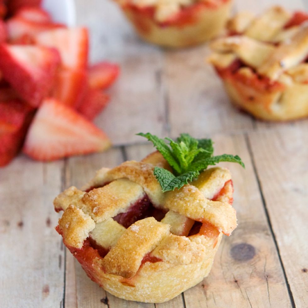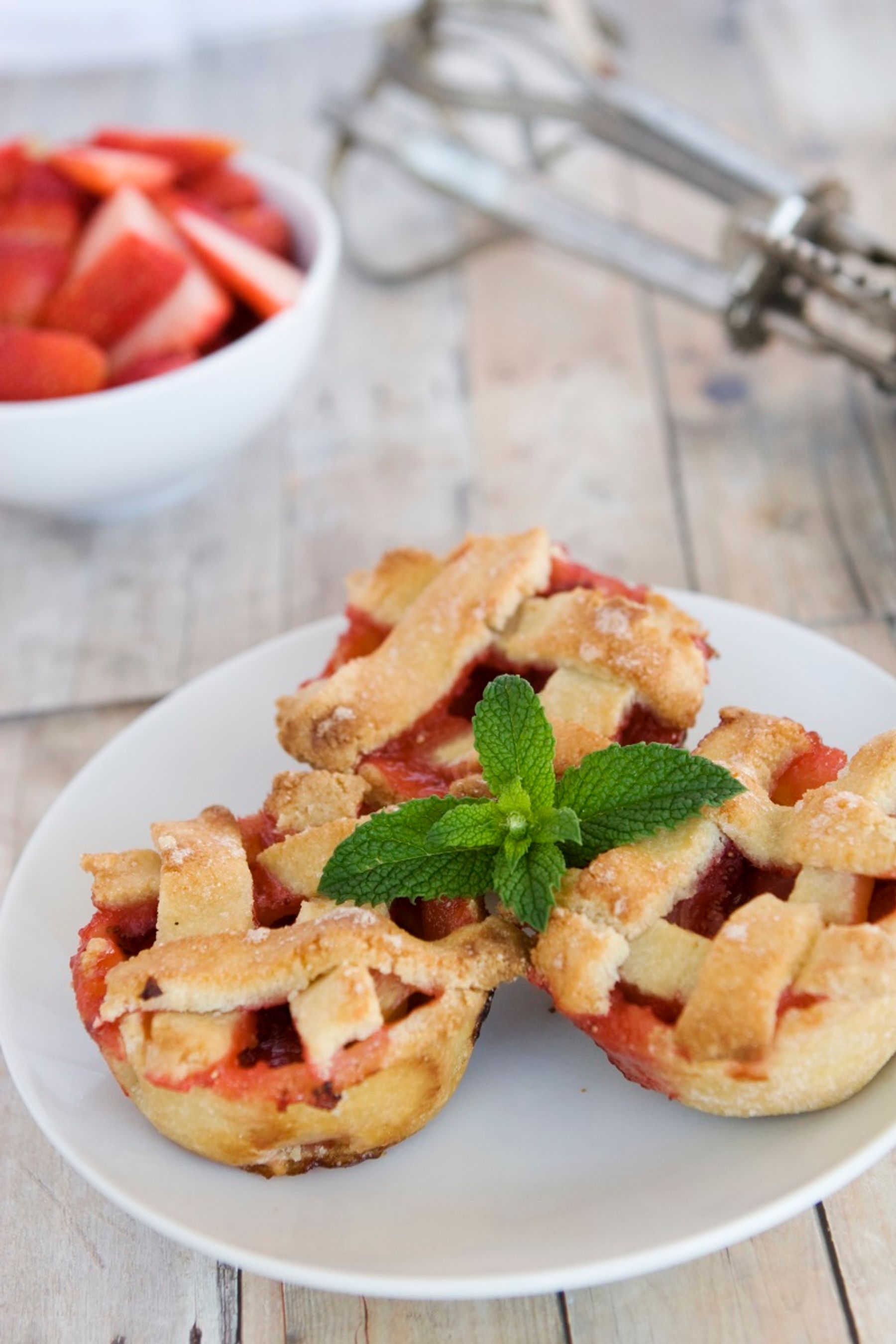 Mini strawberry rhubarb pies with rich, golden, flaky gluten free pie crust. Made with fresh strawberries and gluten free flours. Perfect for breakfast, dessert, or a picnic take-a-long.