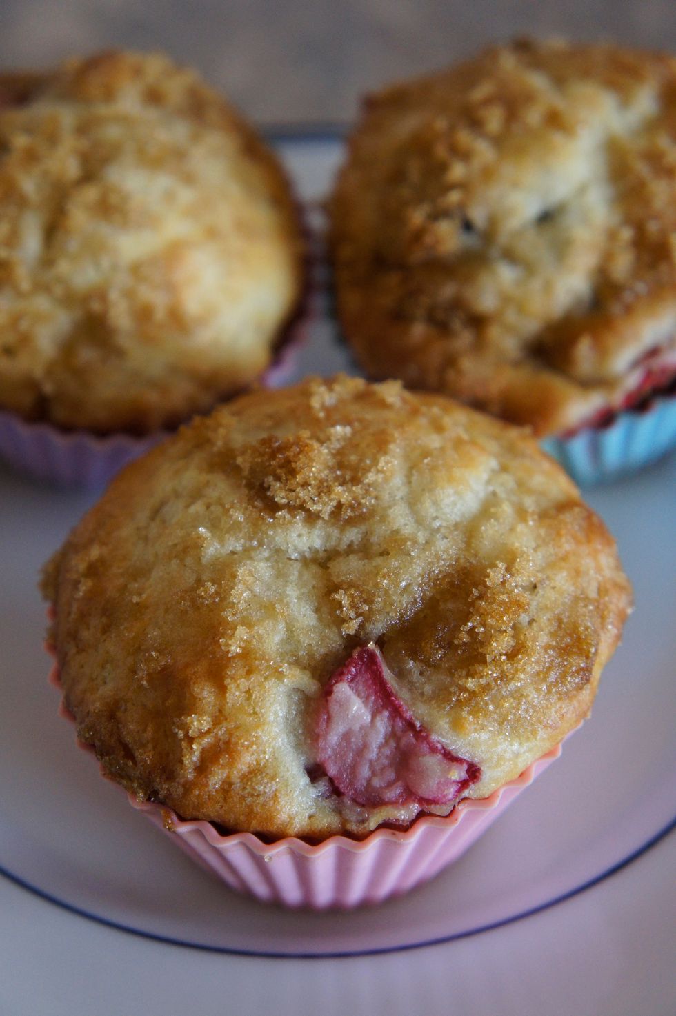 A cake like muffin filled with tart rhubarb and sweet strawberries.