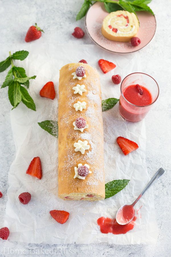 A light and fluffy Swiss roll with fresh strawberries and whipped cream, drizzled with a homemade berry sauce. The perfect summer dessert!