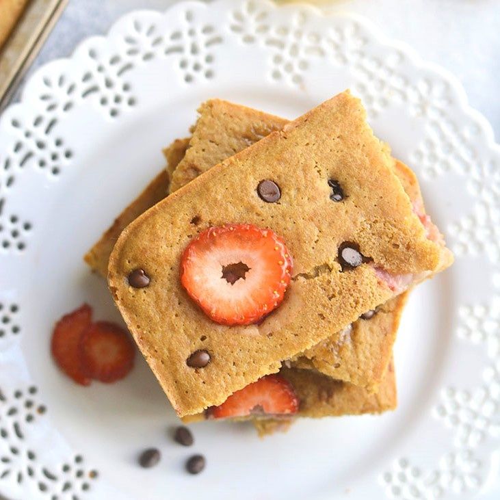 Strawberry Sheet Pan Pancakes! An easy way to make pancakes in the oven! Just blend the ingredients, pour, bake and slice. An easy way to meal prep a healthy breakfast for the week. This recipe allows you to make all your pancakes at one time without the mess. Gluten Free + Low Calorie